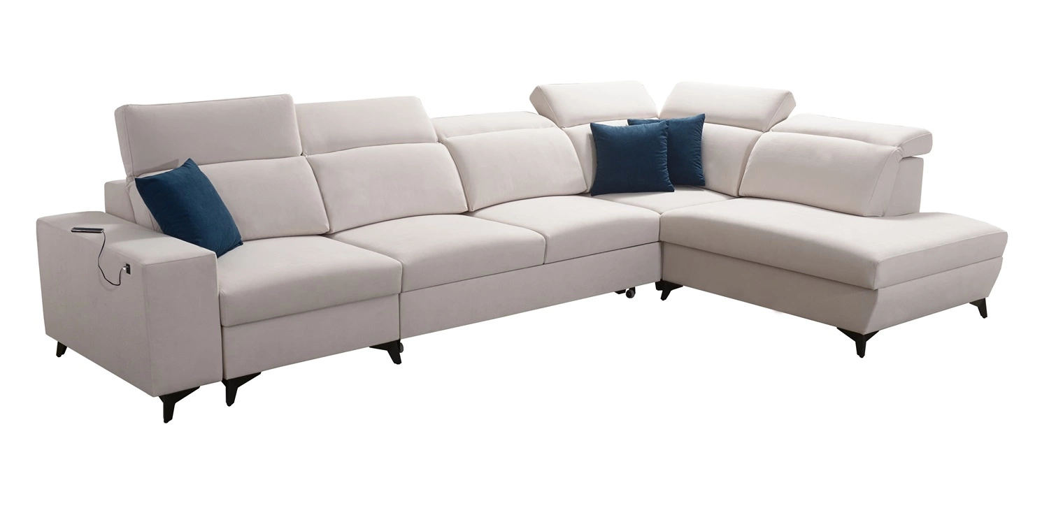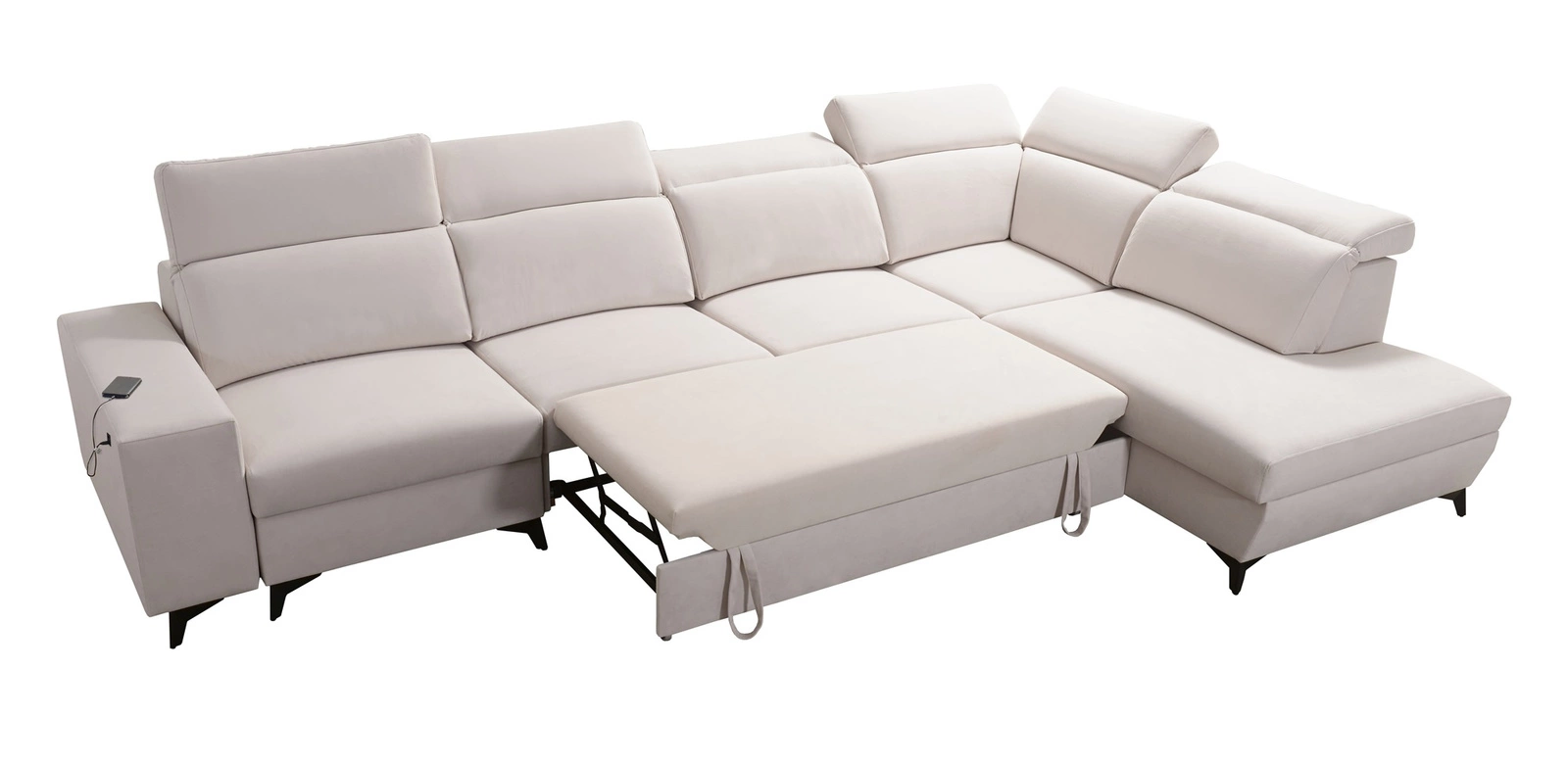 Dodatki tego mebla, które docenią wszyscy użytkownicy to pojemniki na pościel, funkcja spania, gniazdo USB w boczku narożnika do ładowania telefonu i innych urządzeń multimedialnych.