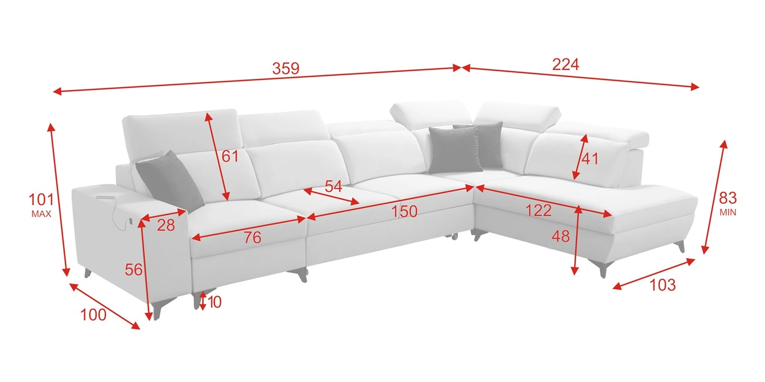 Wymiary mebla pozwolą na zapełnienie przestrzeni w przestronnym salonie lub pokoju dziennym. Szerokość narożnika 359 cm, wysokość maksymalna 101 cm oraz głębokość 224 cm. Powierzchnia spania narożnika wynosi 122x202 cm. Wysokość siedziska mebla to 48 cm a maksymalna wysokość oparcia wynosi 61 cm. Sprężyny faliste oraz pianka poliuretanowa T30 to materiał, z którego wykonane zostało siedzisko narożnika. Oparcie stałe z regulowanymi zagłówkami daje gwarancję wygodnego wypoczynku po długim dniu, które docenisz Ty, Twoi bliscy a także goście, którzy zasiądą na tym wyjątkowym narożniku.