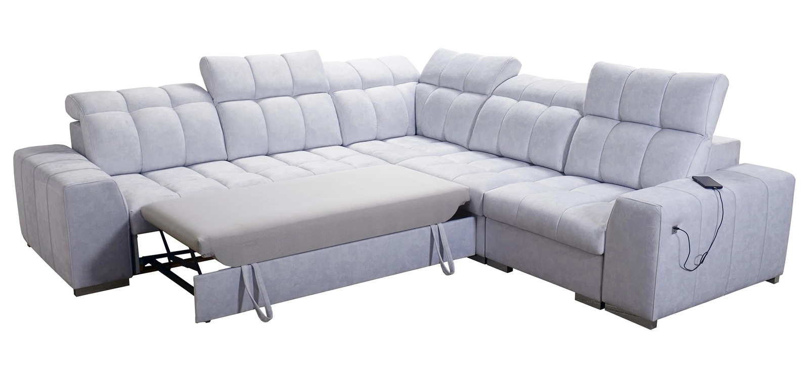 Dodatki tego mebla, które docenią wszyscy użytkownicy to pojemniki na pościel, funkcja spania oraz gniazdo ładowania USB w boczku narożnika.