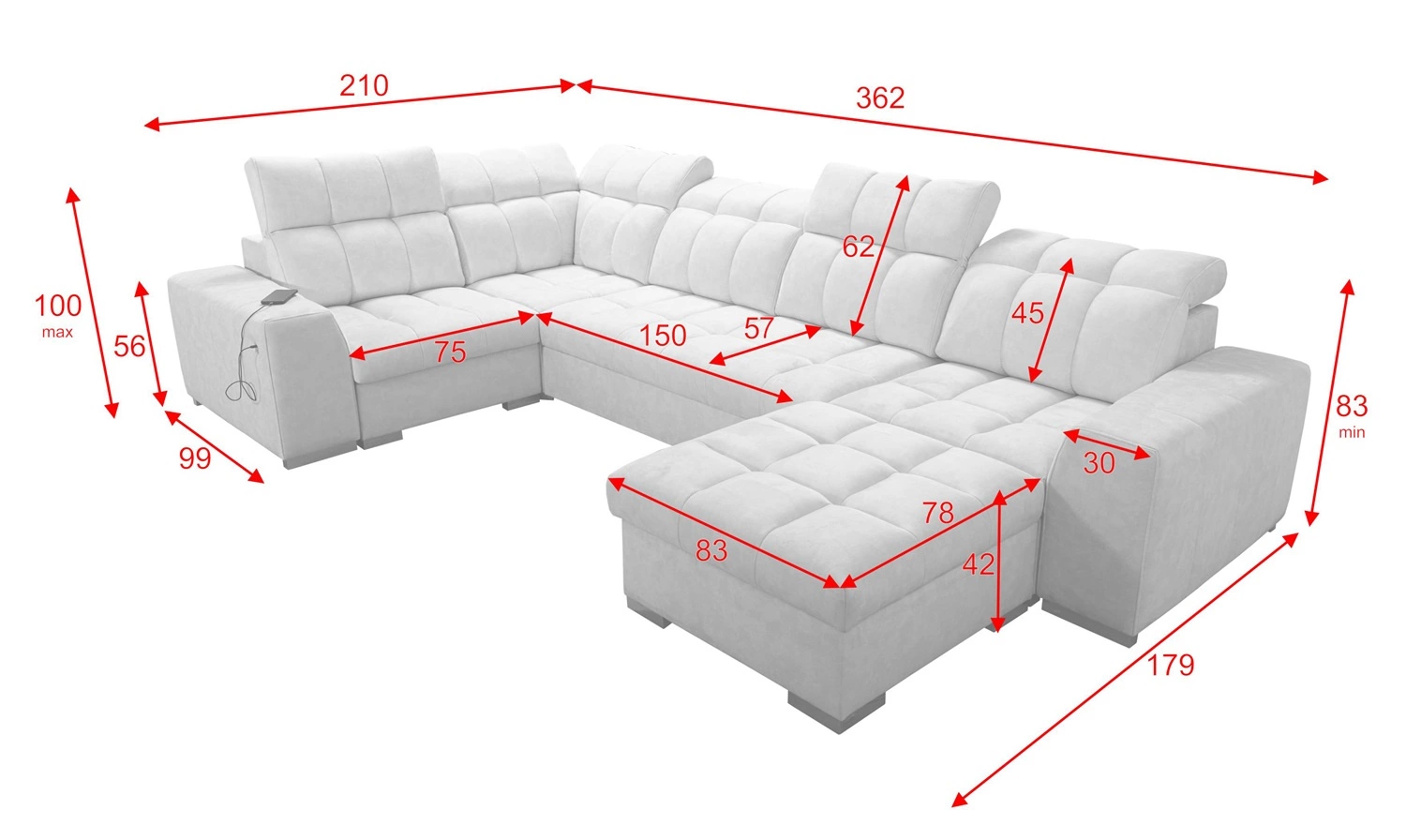 Wymiary mebla pozwolą na zapełnienie przestrzeni w przestronnym salonie lub pokoju dziennym. Szerokość narożnika 362 cm, wysokość maksymalna 100 cm oraz głębokość 210 cm. Powierzchnia spania narożnika wynosi 130x288 cm. Wysokość siedziska mebla to 42 cm a maksymalna wysokość oparcia wynosi 62 cm. Sprężyny faliste oraz pianka poliuretanowa T30 to materiał, z którego wykonane zostało siedzisko narożnika. Oparcie stałe z regulowanymi zagłówkami pozwoli na łatwe dostosowanie kąta nachylenia zagłówków do swoich preferencji oraz daje gwarancję wygodnego wypoczynku po długim dniu, które docenisz Ty, Twoi bliscy a także goście, którzy zasiądą na tym wyjątkowym narożniku.