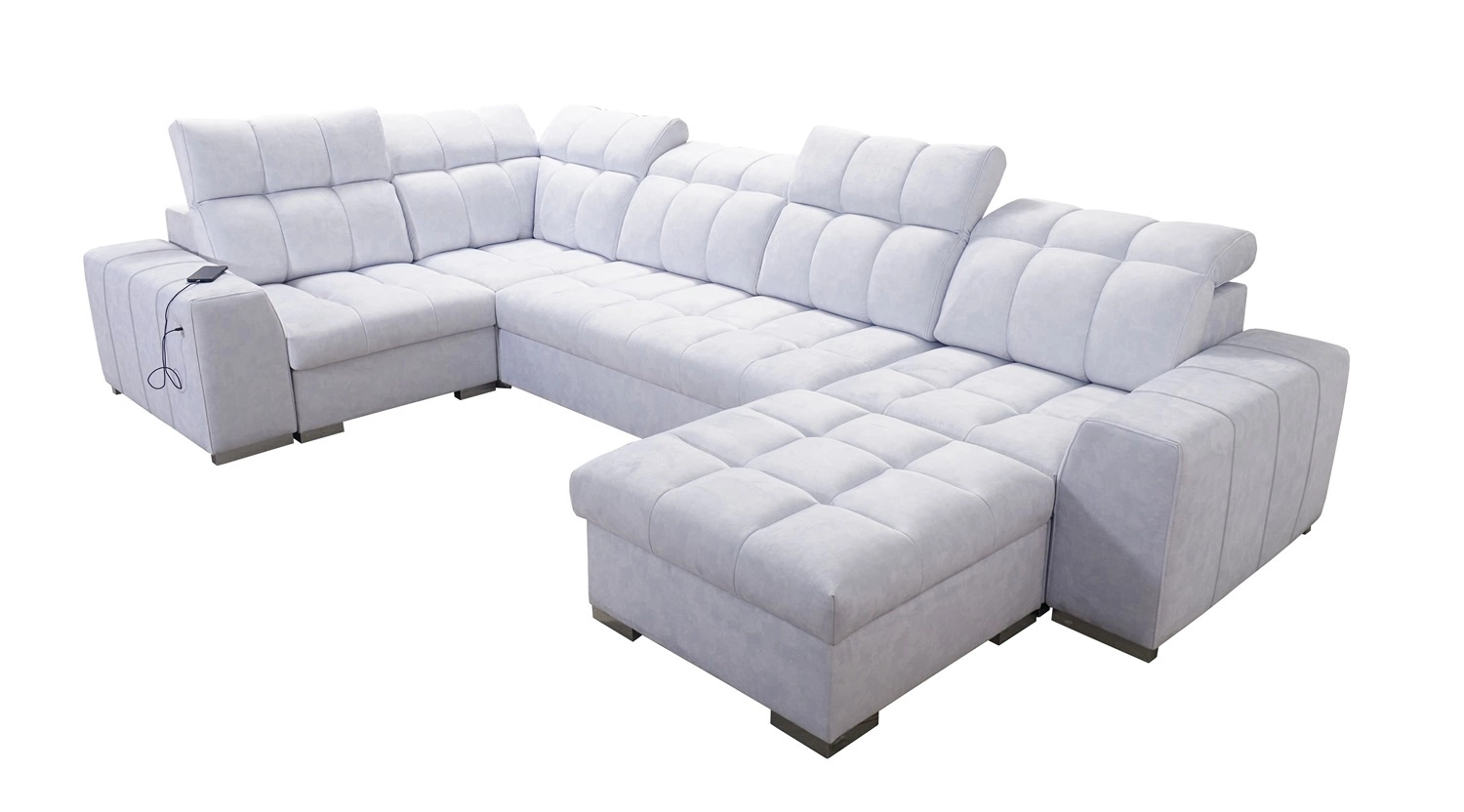 Dodatki tego mebla, które docenią wszyscy użytkownicy to pojemniki na pościel, funkcja spania oraz gniazdo ładowania USB w boczku narożnika.