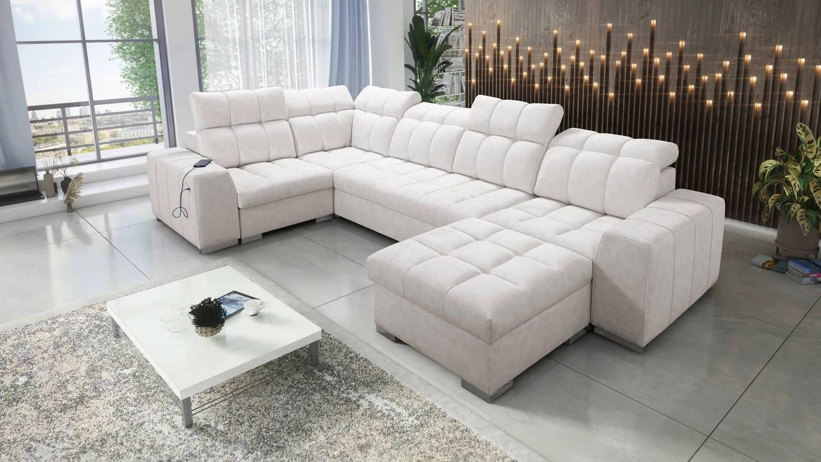 Narożnik Luigi IV w kolorze jasny beż z regulowanymi zagłówkami to zachwycający mebel z gwarancją najwyższego komfortu i funkcjonalności.