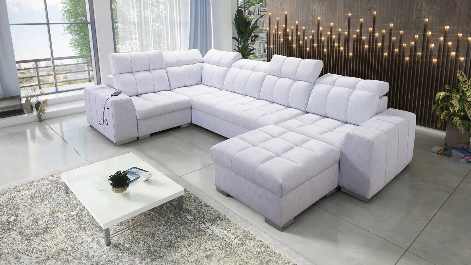 Dodatki tego mebla, które docenią wszyscy użytkownicy to pojemniki na pościel, funkcja spania oraz gniazdo ładowania USB w boczku narożnika.