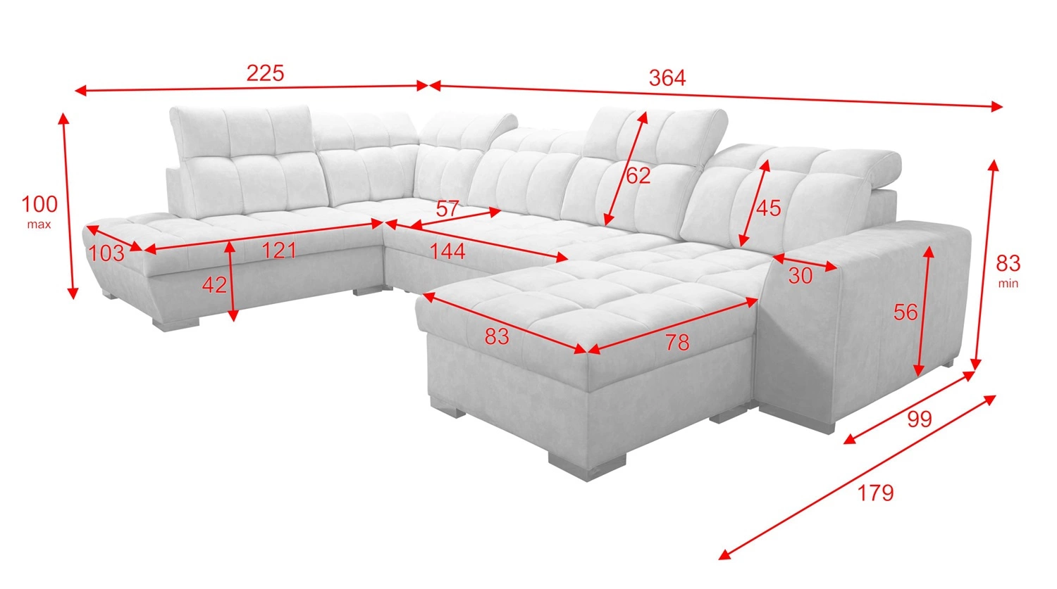 Wymiary mebla pozwolą na zapełnienie przestrzeni w przestronnym salonie lub pokoju dziennym. Szerokość narożnika 364 cm, wysokość maksymalna 100 cm oraz głębokość 225 cm. Powierzchnia spania narożnika wynosi 133x282 cm. Wysokość siedziska mebla to 42 cm a maksymalna wysokość oparcia wynosi 62 cm. Sprężyny faliste oraz pianka poliuretanowa T30 to materiał, z którego wykonane zostało siedzisko narożnika. Oparcie stałe z regulowanymi zagłówkami pozwoli na łatwe dostosowanie kąta nachylenia zagłówków do swoich preferencji oraz daje gwarancję wygodnego wypoczynku po długim dniu, które docenisz Ty, Twoi bliscy a także goście, którzy zasiądą na tym wyjątkowym narożniku.