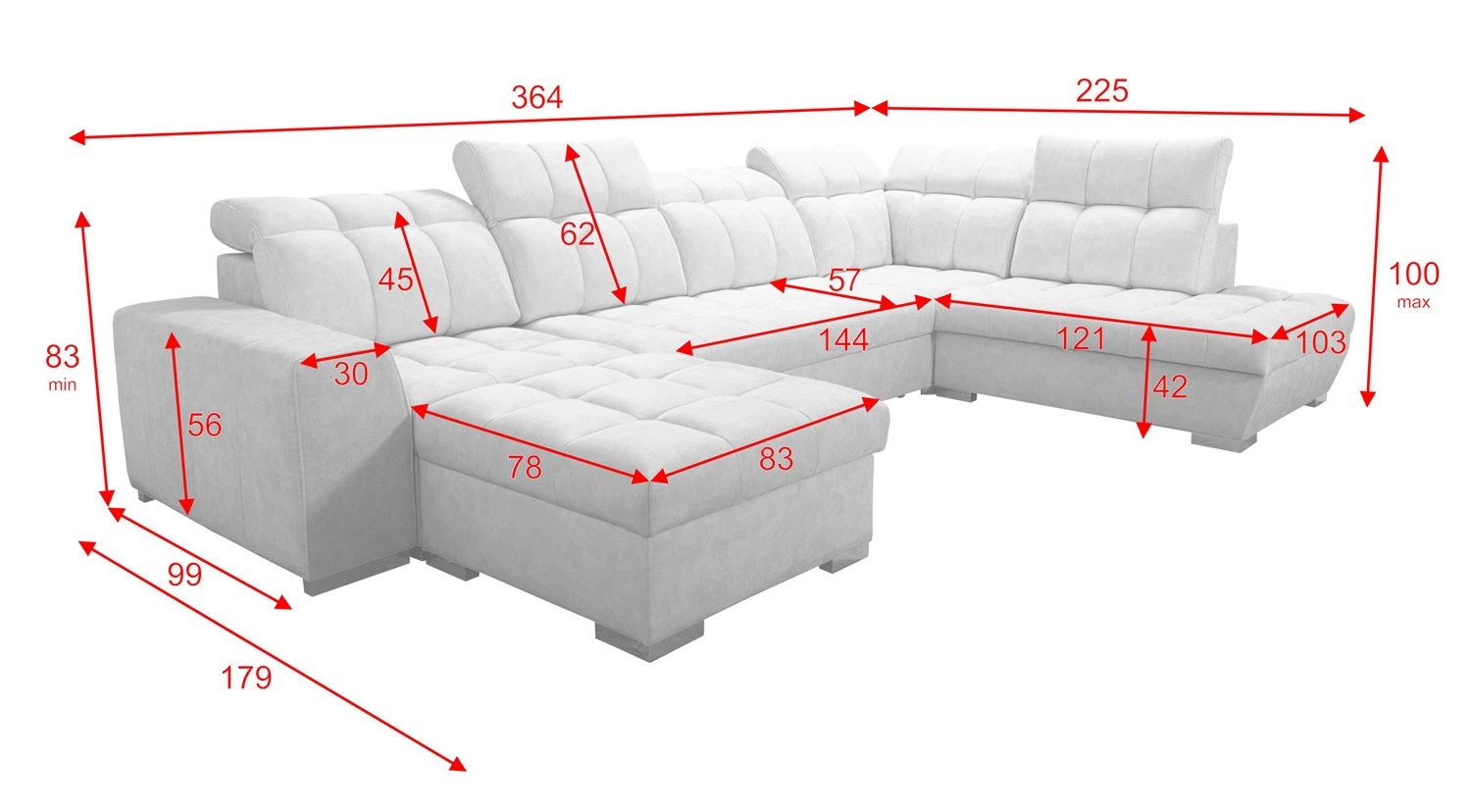 Wymiary mebla pozwolą na zapełnienie przestrzeni w przestronnym salonie lub pokoju dziennym. Szerokość narożnika 364 cm, wysokość maksymalna 100 cm oraz głębokość 225 cm. Powierzchnia spania narożnika wynosi 133x282 cm. Wysokość siedziska mebla to 42 cm a maksymalna wysokość oparcia wynosi 62 cm. Sprężyny faliste oraz pianka poliuretanowa T30 to materiał, z którego wykonane zostało siedzisko narożnika. Oparcie stałe z regulowanymi zagłówkami pozwoli na łatwe dostosowanie kąta nachylenia zagłówków do swoich preferencji oraz daje gwarancję wygodnego wypoczynku po długim dniu, które docenisz Ty, Twoi bliscy a także goście, którzy zasiądą na tym wyjątkowym narożniku.
