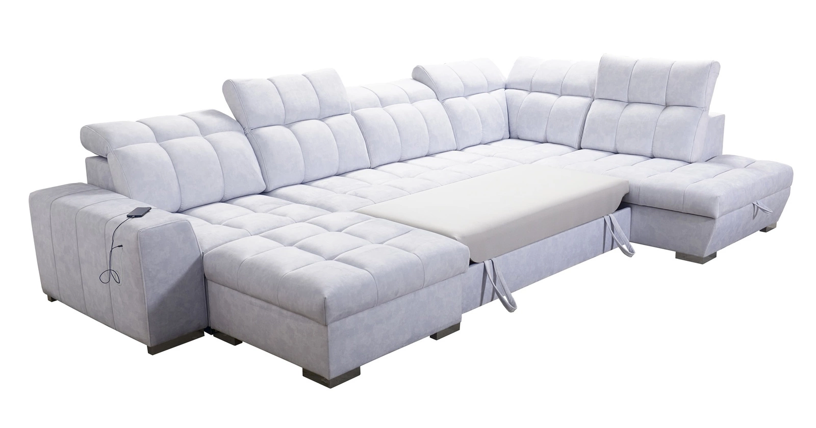 Dodatki tego mebla, które docenią wszyscy użytkownicy to pojemniki na pościel, funkcja spania oraz gniazdo ładowania USB w boczku narożnika.