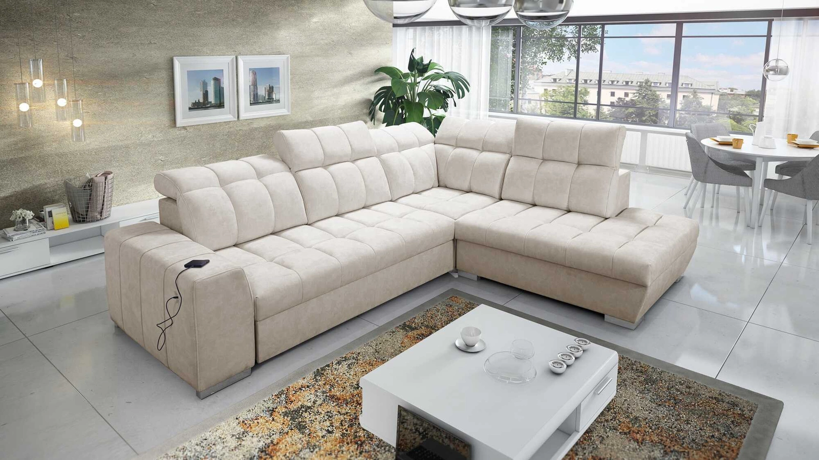 Narożnik Luigi VII w kolorze beżowym z regulowanymi zagłówkami to stylowy mebel z gwarancją najwyższego komfortu i funkcjonalności.