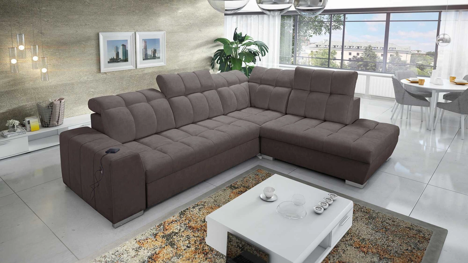 Narożnik z funkcją spania Luigi VII brązowy prawostronny komfortowy narożnik rozkładany utrzymany w nowoczesnej formie