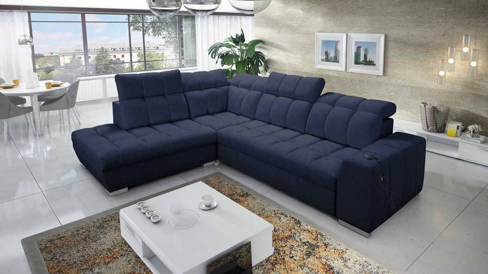 Narożnik Luigi VII w kolorze granatowym z regulowanymi zagłówkami to stylowy mebel z gwarancją najwyższego komfortu i funkcjonalności.