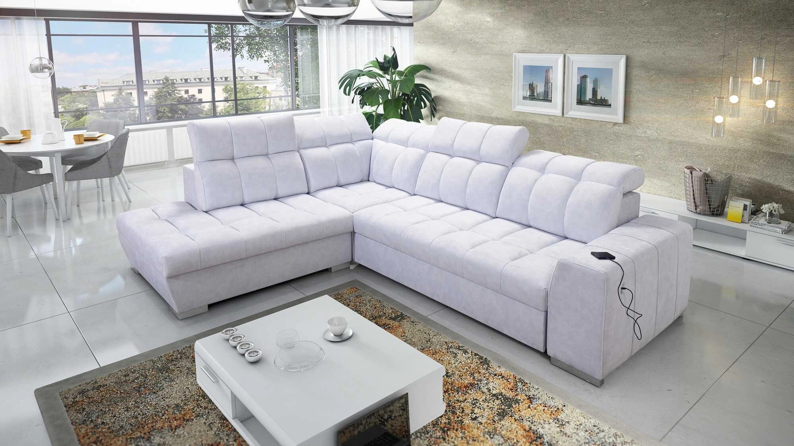 Dodatki tego mebla, które docenią wszyscy użytkownicy to pojemnik na pościel, funkcja spania oraz gniazdo ładowania USB w boczku narożnika.