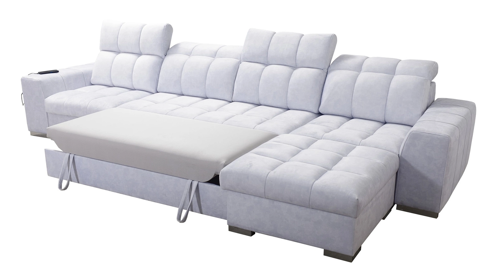 Dodatki tego mebla, które docenią wszyscy użytkownicy to pojemniki na pościel, funkcja spania oraz gniazdo ładowania USB w boczku narożnika.
