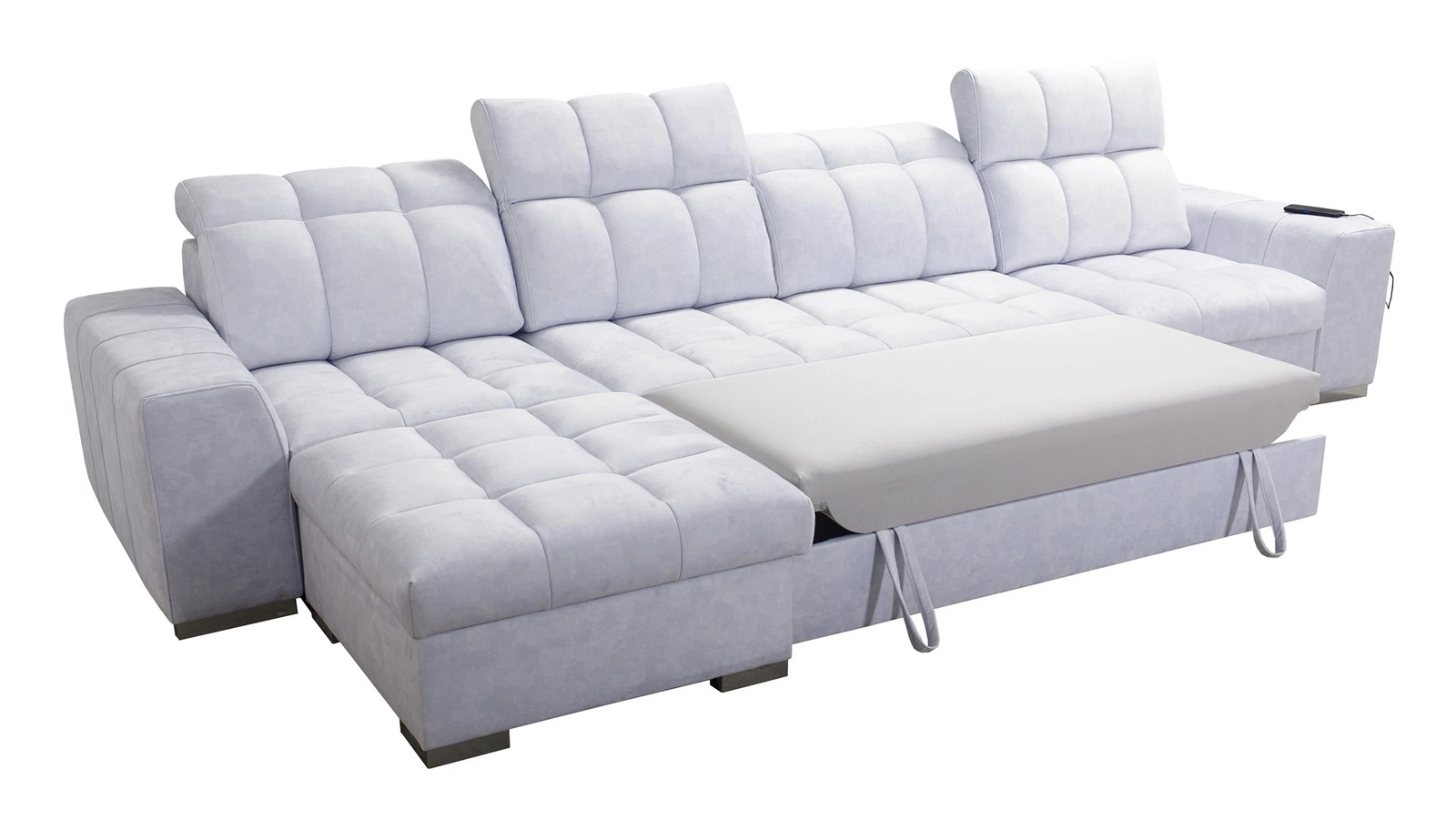 Dodatki tego mebla, które docenią wszyscy użytkownicy to pojemniki na pościel, funkcja spania oraz gniazdo ładowania USB w boczku narożnika.