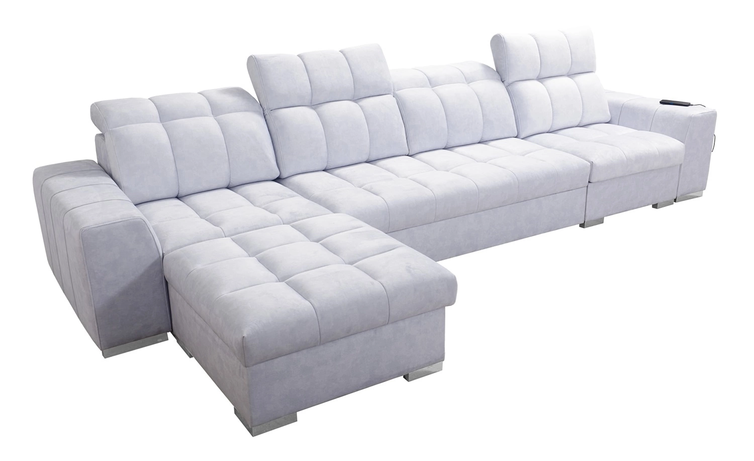 Dodatki tego mebla, które docenią wszyscy użytkownicy to pojemniki na pościel, funkcja spania oraz gniazdo ładowania USB w boczku narożnika.