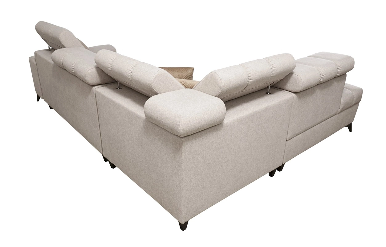 Wymiary mebla pozwolą na zapełnienie przestrzeni w przestronnym salonie lub pokoju dziennym. Szerokość narożnika 280 cm, wysokość maksymalna 100 cm oraz głębokość 217 cm. Powierzchnia spania narożnika wynosi 127x210 cm. Wysokość siedziska mebla to 45 cm a maksymalna wysokość oparcia wynosi 60 cm. Sprężyny faliste oraz pianka poliuretanowa T30 to materiał, z którego wykonane zostało siedzisko narożnika. Oparcie z regulowanymi zagłówkami pozwoli na łatwe dostosowanie kąta nachylenia zagłówków do swoich preferencji oraz daje gwarancję wygodnego wypoczynku po długim dniu, które docenisz Ty, Twoi bliscy a także goście, którzy zasiądą na tym wyjątkowym narożniku.