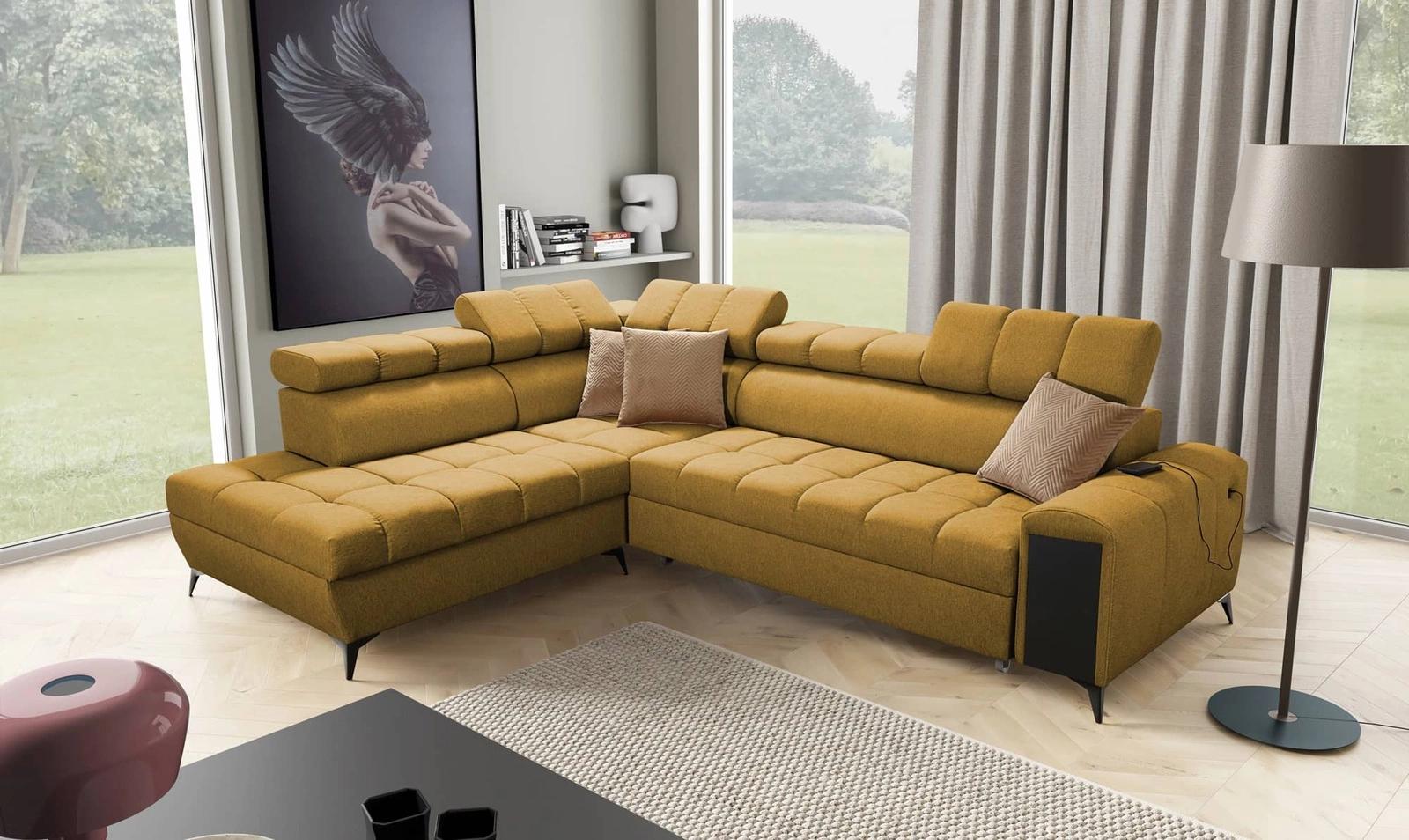 Narożnik Bolmso VII w kolorze musztardowym z regulowanymi zagłówkami to zachwycający mebel z gwarancją najwyższego komfortu i funkcjonalności.