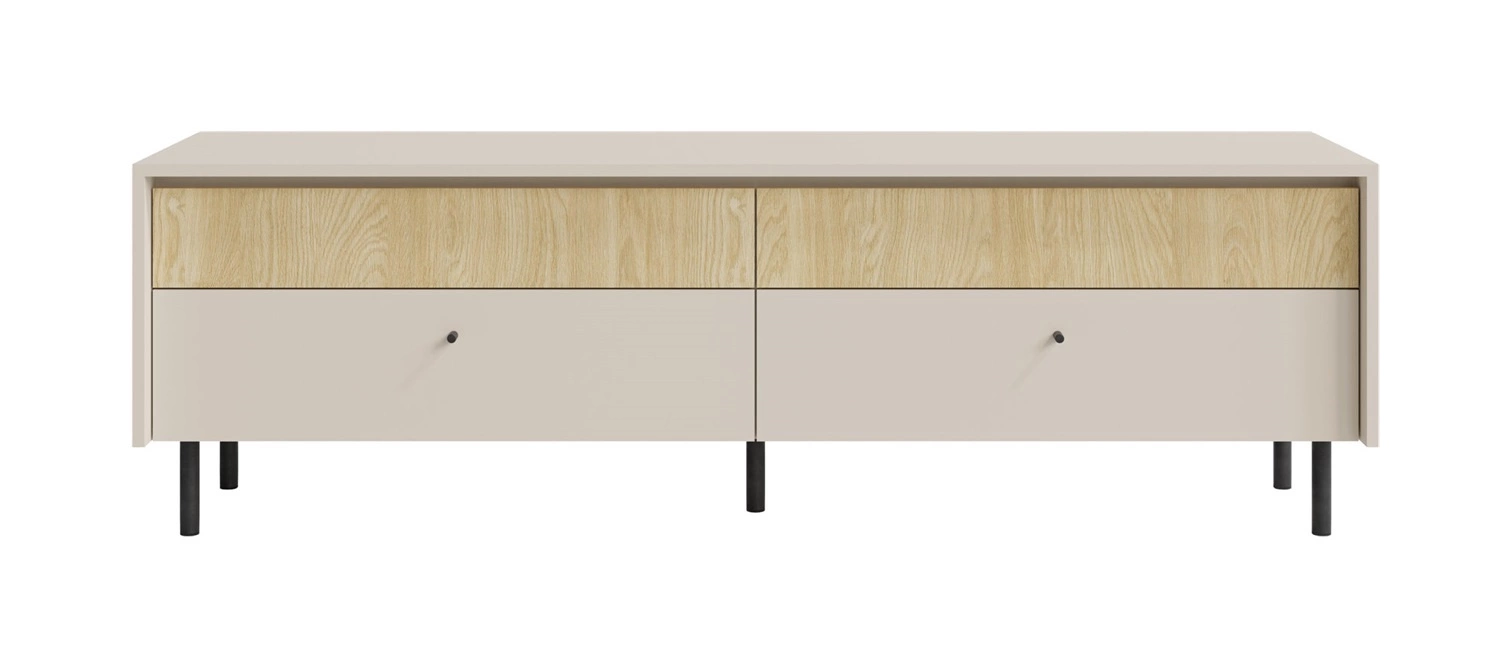 Szafka pod telewizor Cappo charakteryzuje się wyjątkowo subtelnym i modnym połączeniem beżu w piaskowym odcieniu z dębowym dekorem. Istotnym detalem, który współgra z całością mebla są niewielkie, eleganckie czarne uchwyty. Smukłe, metalowe nogi nadają lekkości, jednocześnie tworząc interesujący kontrast z prostą bryłą szafki RTV. Staranne wykończenie oraz nietuzinkowość szafki z szufladami wprowadzi wyjątkową atmosferę do każdego wnętrza w stylu klasycznym, nowoczesnym jak, i skandynawskim. Ten zachwycający mebel o szczególnym i niepowtarzalnym charakterze nada finezji i elegancji dodatkowo tworząc efektowną dekorację.
