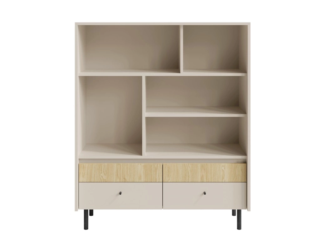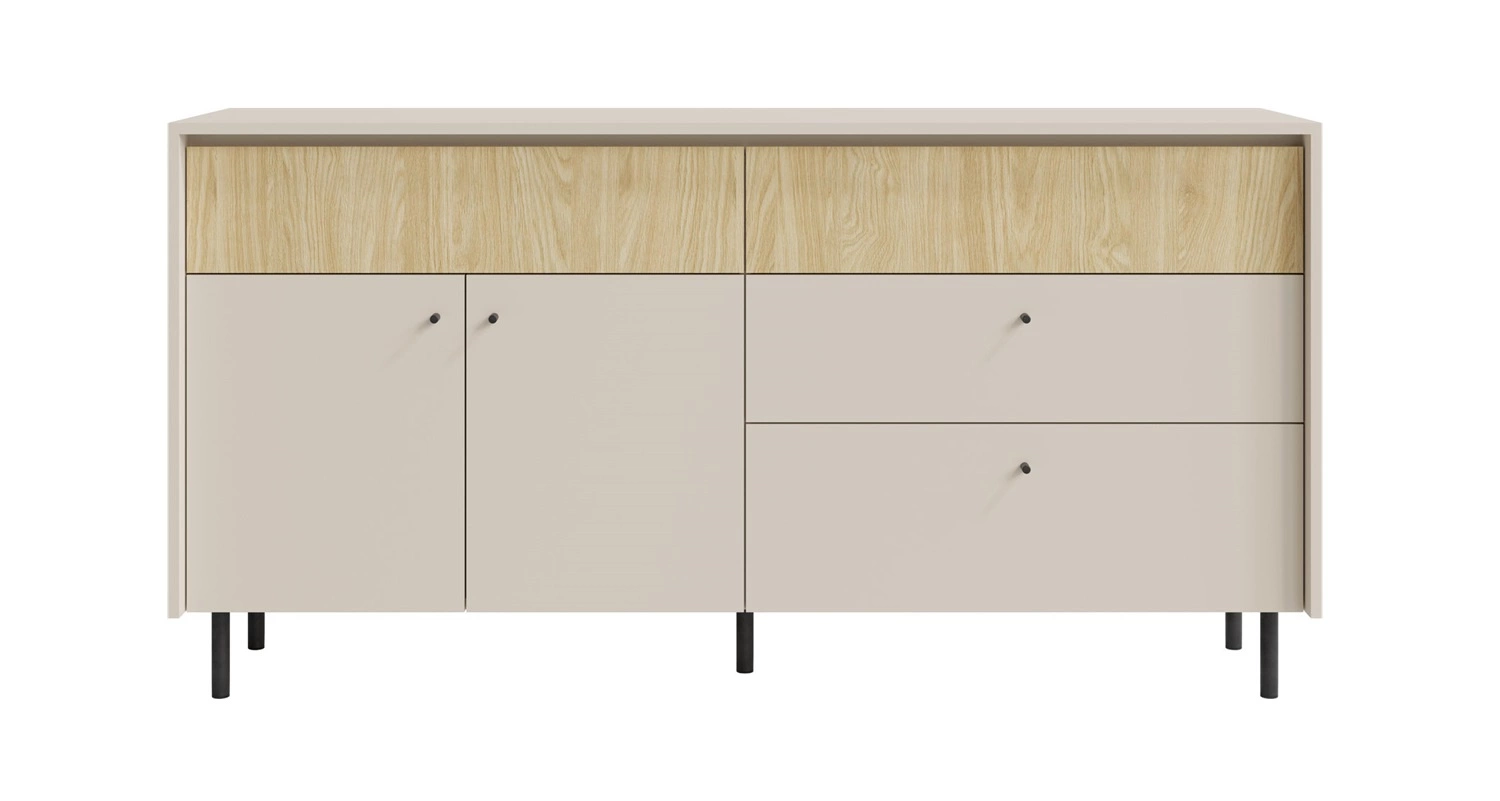 Zestaw mebli Cappo charakteryzuje się wyjątkowo subtelnym i modnym połączeniem beżu w piaskowym odcieniu z dębowym dekorem. Istotnym detalem, który współgra z całością meblościanki są niewielkie, eleganckie czarne uchwyty. Smukłe, metalowe nogi nadają lekkości, jednocześnie tworząc interesujący kontrast z prostymi bryłami meblościanki. Staranne wykończenie oraz nietuzinkowość mebli do salonu wprowadzi wyjątkową atmosferę do każdego wnętrza w stylu klasycznym, nowoczesnym jak, i skandynawskim. Te zachwycające meble o szczególnym i niepowtarzalnym charakterze nadają finezji i elegancji dodatkowo tworząc efektowną dekorację.