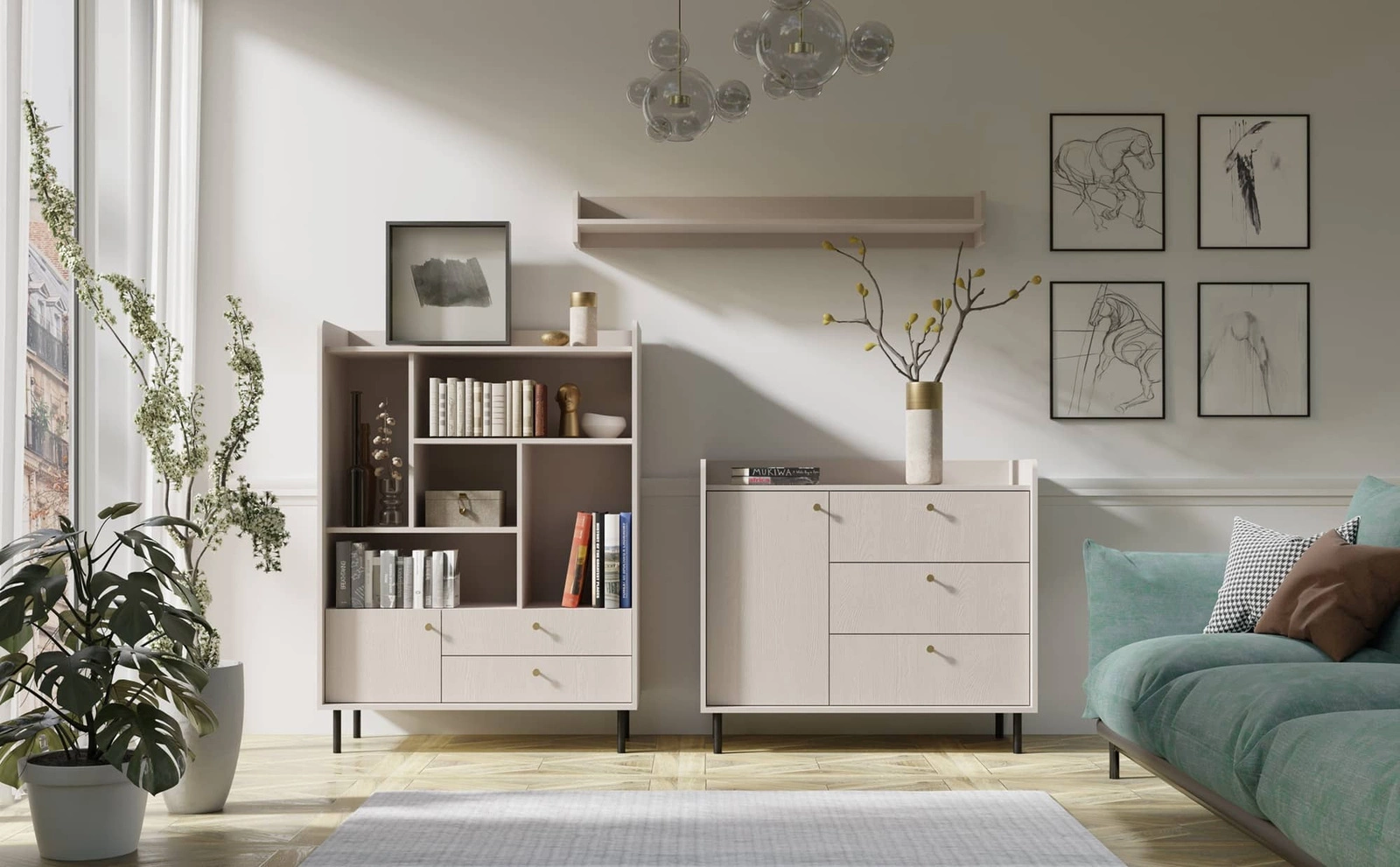Regał jest wyposażony w 2 szuflady oraz 1 zamykaną szafkę. Regały do salonu zostały zaprojektowane w sposób funkcjonalny i użytkowy, oferując dużo miejsca do przechowywania. Subtelna kolorystyka świetnie odnajdzie się w klasycznych aranżacjach, dzięki czemu regały pokojowe z kolekcji Ferdi świetnie sprawdzą się jako regały do salonu, regały do pokoju młodzieżowego lub regał biurowy.