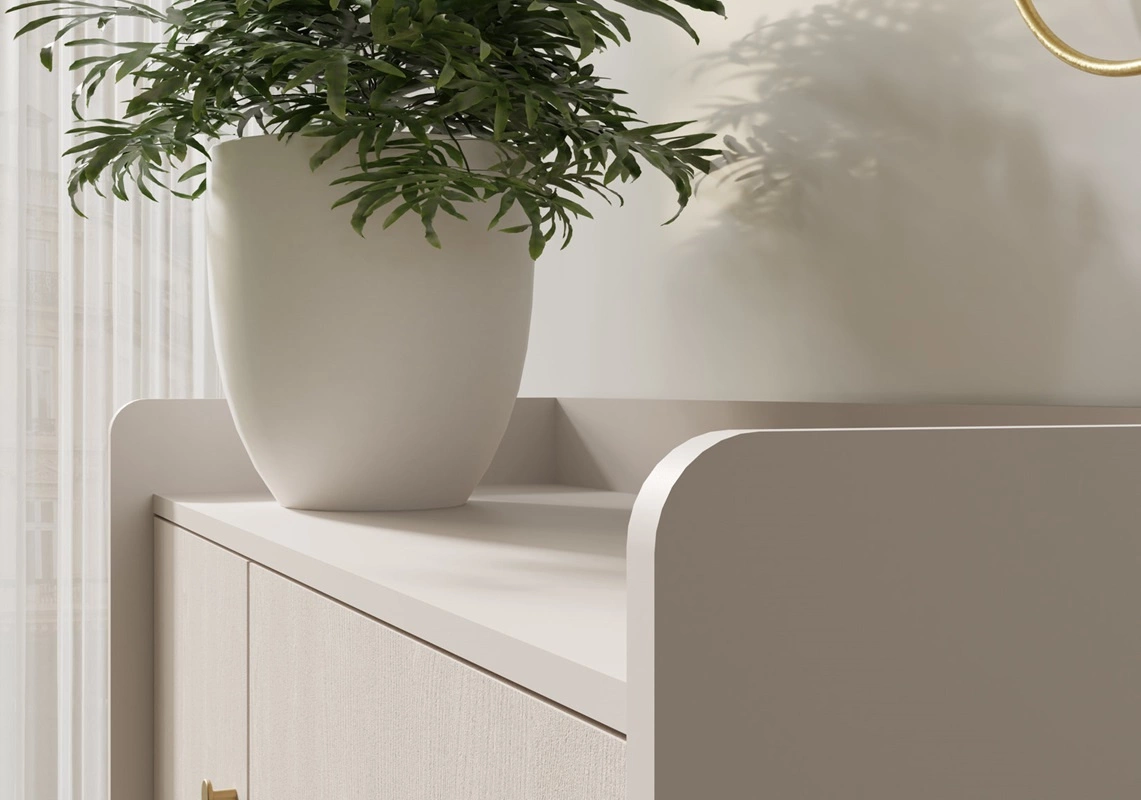 - Regał Ferdi to prosty lecz bardzo elegancki i oryginalny mebel. Struktura drewna w odcieniu piaskowego beżu idealnie współgra ze złotymi akcentami nadając meblom subtelnego charakteru. Wysokie ranty blatu podkreślają nietuzinkowość regału.