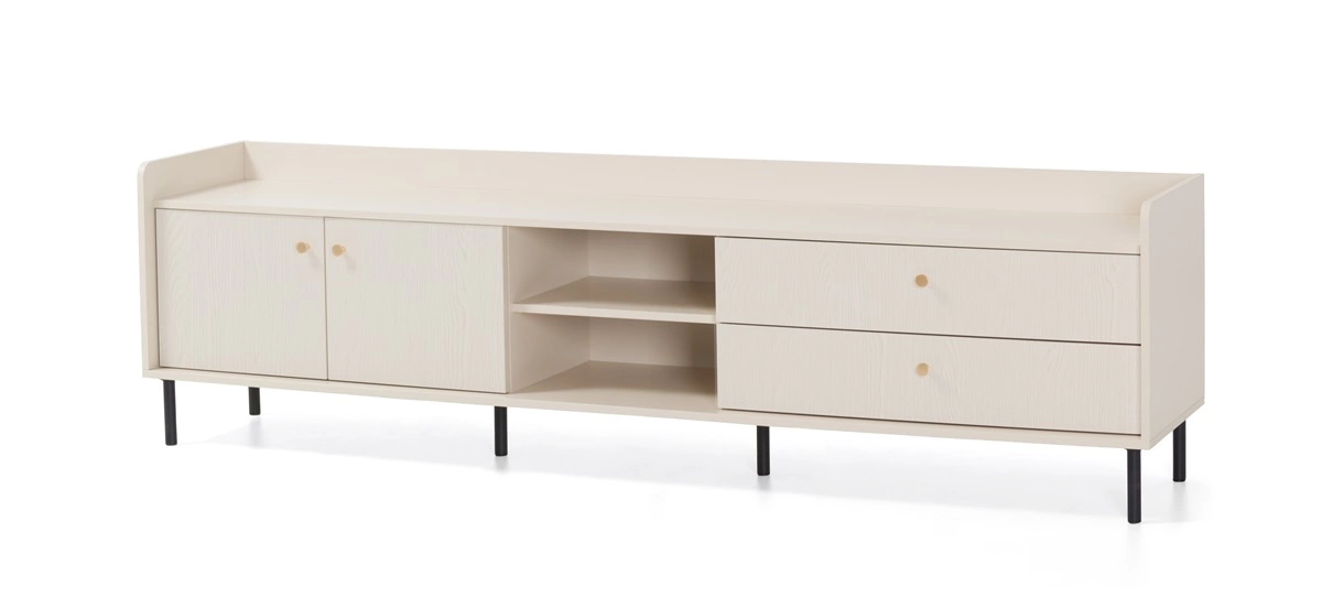 Szafka RTV Ferdi 210 cm beż piaskowy minimalistyczny design szafki z szufladami eleganckie złote uchwyty i wysokie ranty blatu