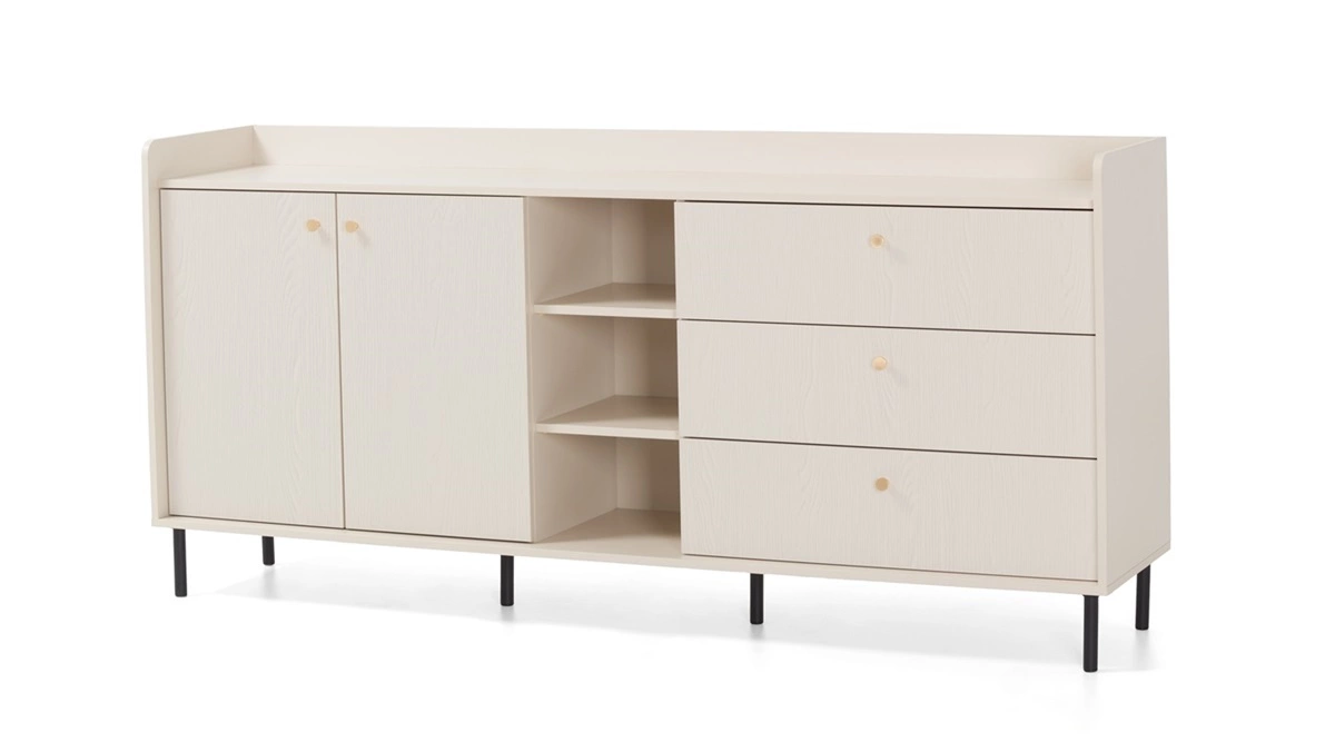 Zestaw mebli Ferdi to zachwycające meble o szczególnym i niepowtarzalnym charakterze. Intrygująca struktura drewna w subtelnym odcieniu piaskowego beżu idealnie współgra ze złotymi uchwytami nadając meblościance minimalistycznego i eleganckiego charakteru. Wysokie ranty blatu podkreślą nietuzinkowość mebli do salonu oraz zapobiegną niefortunnym upadkom przedmiotów stanowiących dekorację wnętrza. Smukłe, metalowe nogi nadają lekkości, jednocześnie tworząc interesujący kontrast z prostymi bryłami zestawu. Praktyczne, otwarte półki komody to idealne miejsce na ulubione książki. Unikatowe wzornictwo meblościanki sprawdzi się nawet w najbardziej wymagającym wnętrzu.