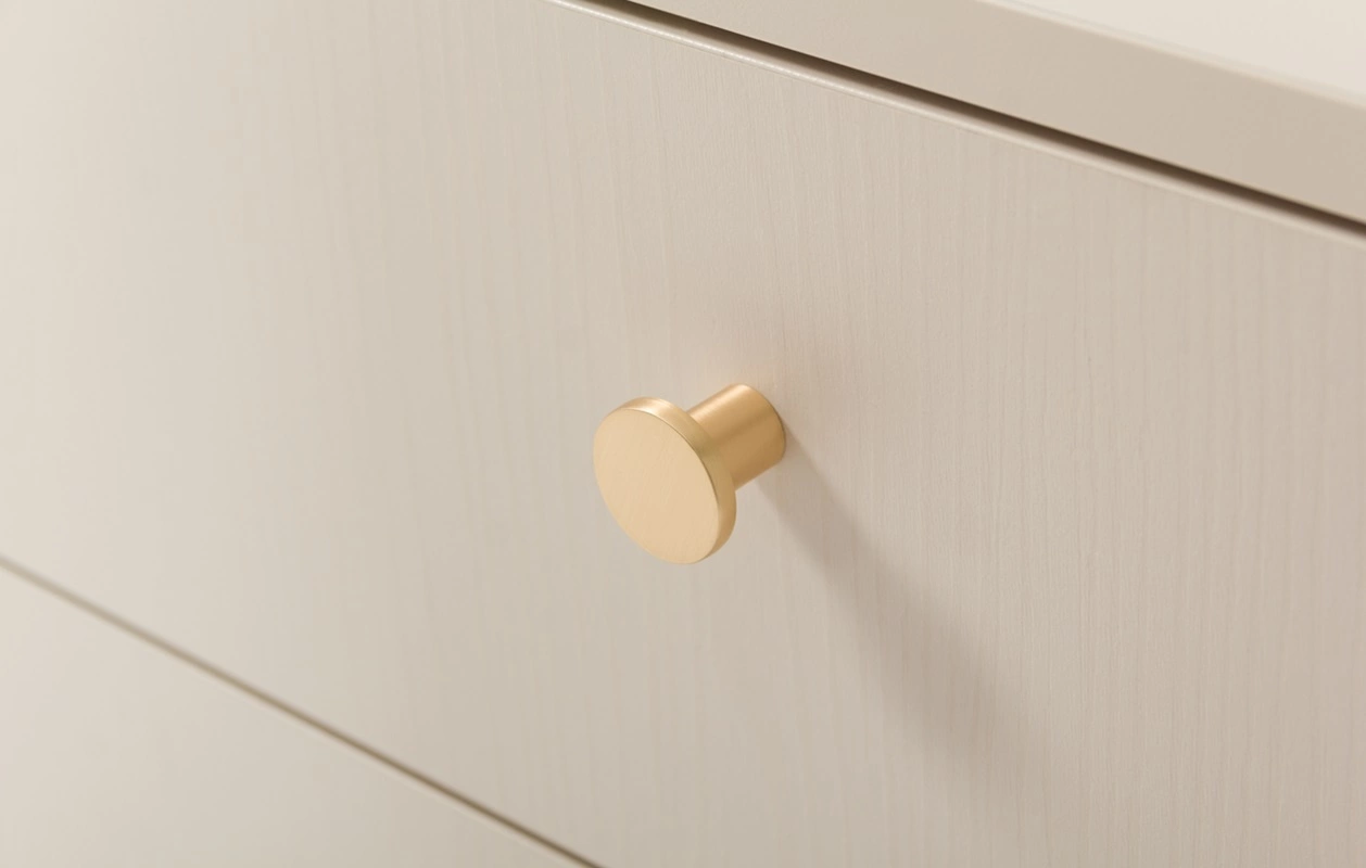 - Zestaw mebli Ferdi to proste lecz bardzo eleganckie i oryginalne meble. Struktura drewna w odcieniu piaskowego beżu idealnie współgra ze złotymi akcentami nadając meblom subtelnego charakteru. Wysokie ranty blatu podkreślają nietuzinkowość meblościanki.