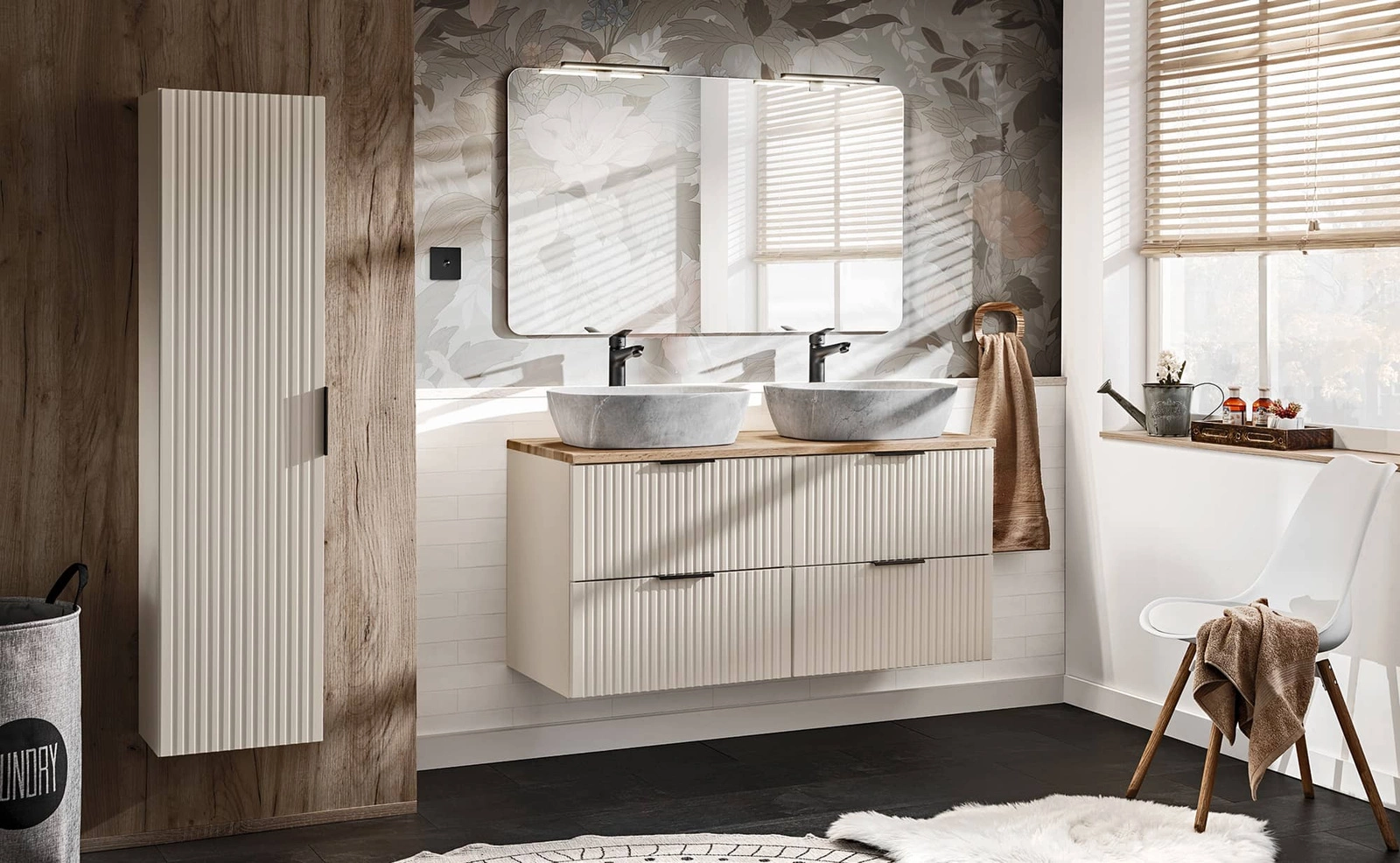 Meble z kolekcji Adeel staną się idealnym dopełnieniem aranżacji, wnosząc elegancję i praktyczność do każdej łazienki.