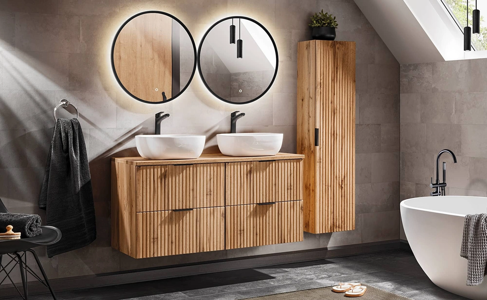 Meble do łazienki Adeel to niezwykle trwałe meble łazienkowe, które łączą wysoką elegancję i funkcjonalność. Elementem wyróżniającym meble z kolekcji Adeel są pionowe ryflowania na frontach szafek, które nadają meblom unikalnego charakteru, dodatkowo optycznie powiększając przestrzeń łazienki. Dekor dębu wotan wprowadza ciepło naturalnego drewna, doskonale komponując się z różnorodnymi aranżacjami wnętrz. Dodatkowym atutem szafek do łazienki są trzy opcje kolorystyczne uchwytów: złoty połysk, chrom połysk oraz czarny mat, pozwalając na dalszą personalizację i dopasowanie mebli do preferencji stylistycznych.