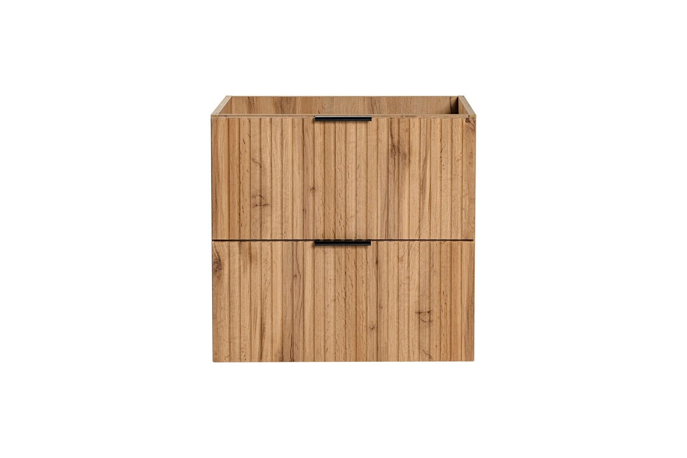 Korpusy szafek są wykonane z wysokiej jakości płyty laminowanej o grubości 16 mm. Zaletą tego rodzaju płyty jest wysoka odporność na wpływ czynników, często występujących w łazience, takich jak para wodna, wysoka temperatura czy rozlane ciecze. Ryflowane fronty szafek do łazienki zostały wykonane z płyty MDF.