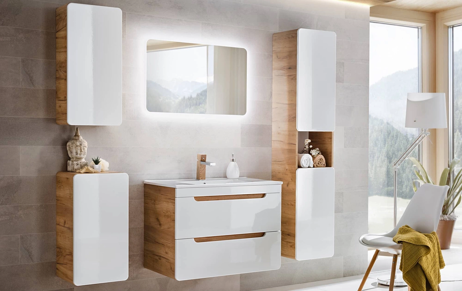 Szafka pod umywalkę Aruba to niezwykle trwały mebel łazienkowy, który zachwyca lekkim i nowoczesnym designem. Subtelne połączenie korpusów w odcieniu ciepłego dębu z białymi frontami wykończonymi w połysku, a także zaoblony kształt bryły sprawia, że meble nadają niebanalnego charakteru, doskonale komponując się z różnorodnymi aranżacjami wnętrz. Frezowane uchwyty nawiązują do najnowszych trendów wnętrzarskich, tworząc spójną całość z subtelną konstrukcją szafki do łazienki. Mnogość i różnorodność brył z kolekcji Aruba pozwoli na skomponowanie indywidualnego i niepowtarzalnego zestawu mebli do łazienki.