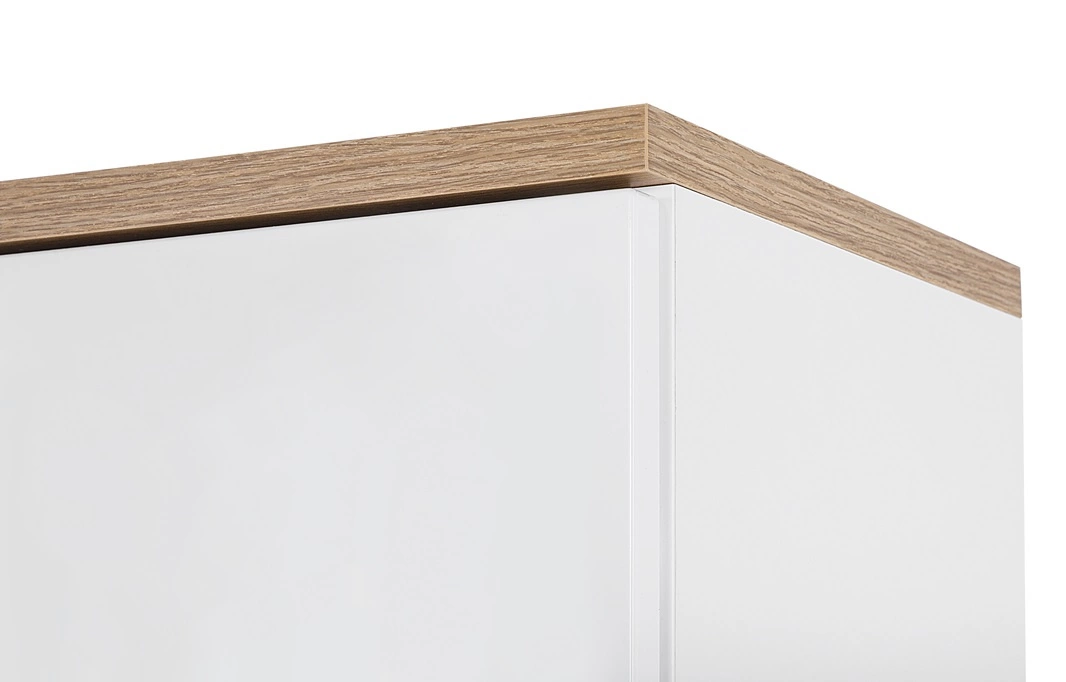 Słupek łazienkowy Bali 60 cm biały połysk / dąb wotan stylowa pojemna szafka do łazienki z frezowanymi uchwytami stabilna podstawa