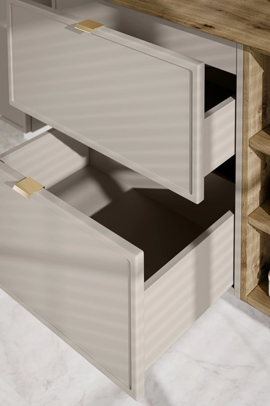 Szafka łazienkowa jest wyposażona w dwie szuflady z systemem cichego domykania. Zastosowany system zwiększa komfort i bezpieczeństwo użytkowania mebli. W celu łatwiejszego montażu odpływu, górna szuflada ma wcięcie. Wszystkie elementy kolekcji Bella wyróżniają się starannym wykonaniem i dbałością o detale, gwarantując estetyczny wygląd i długotrwałą satysfakcję z użytkowania.