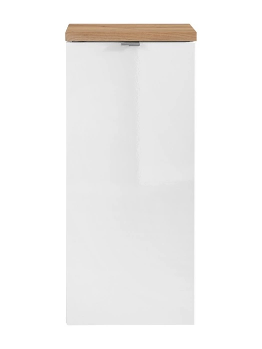 Szafka łazienkowa wisząca Capri 35 cm biały połysk / dąb craft złoty funkcjonalna szafka wyposażona w kosz na pranie metalowy uchwyt