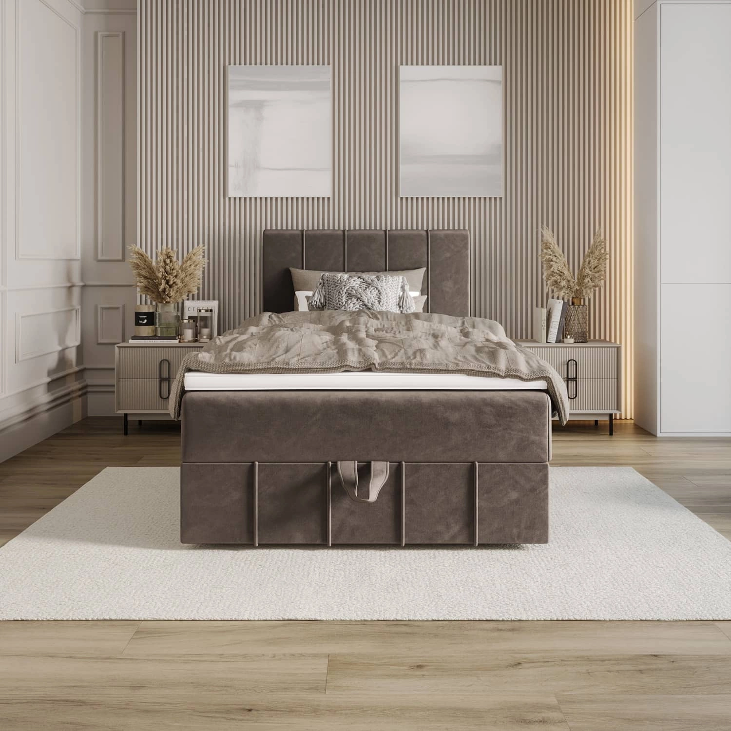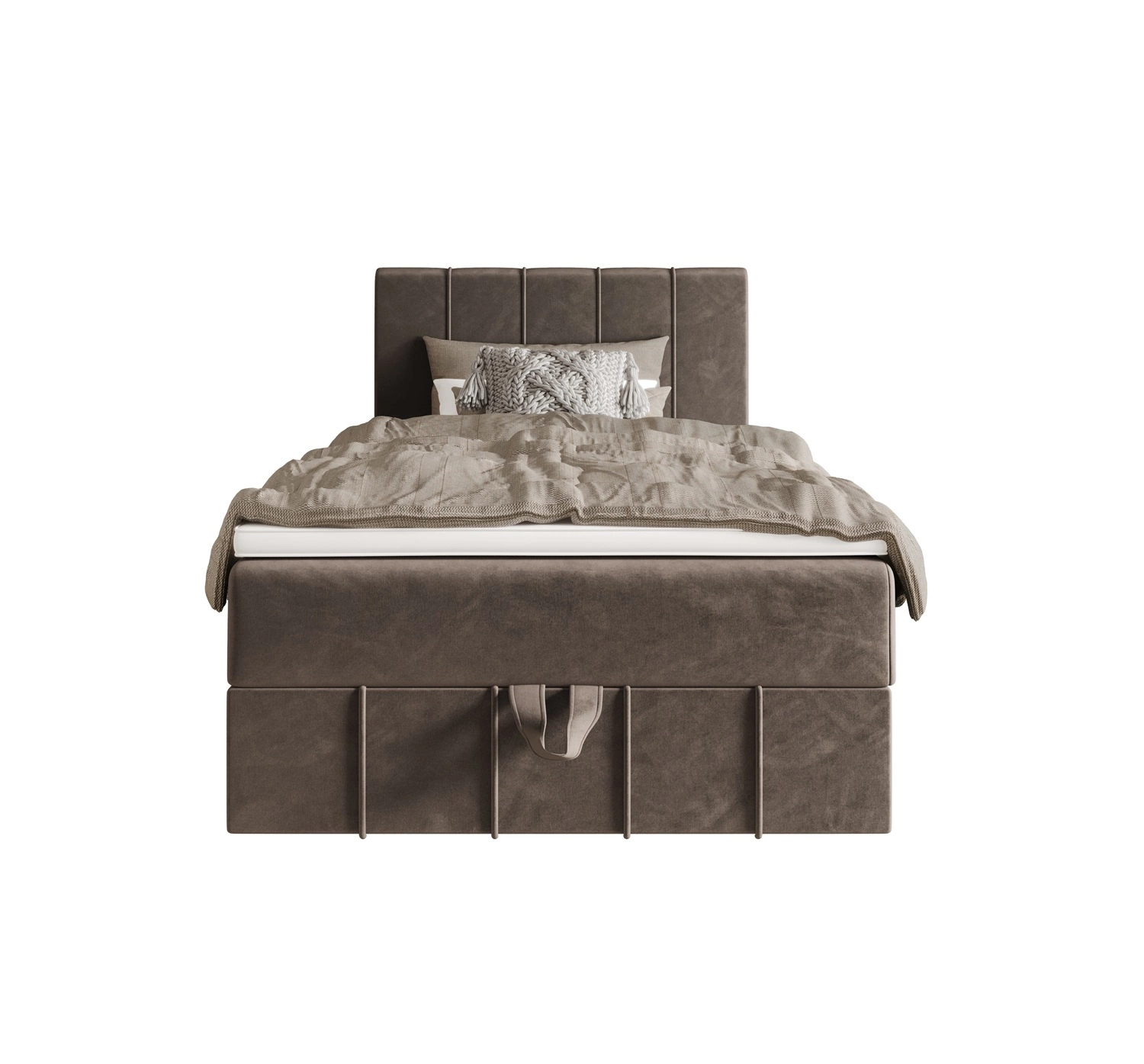 Łóżko wykonane z tkaniny typu velvet Monolith 15 gwarantuje najwyższy komfort i funkcjonalność podczas codziennego wypoczynku w sypialni. Tkanina posiada powłokę hydrofobową, co gwarantuje ograniczone wchłanianie cieczy. Ciekawa struktura tkaniny nadaje wyjątkowego charakteru. Dzięki wszystkim właściwościom użytej tkaniny, łóżko kontynentalne na długo zachowa swój pierwotny wygląd. Konstrukcja łóżka zapewnia dużą stabilność i wygodę użytkowania. Rama łóżka kontynentalnego jest wykonana z drewna oraz płyty meblowej. Pionowe przeszycia na wezgłowiu przyciągają wzrok i nadają łóżku szczególnego charakteru.