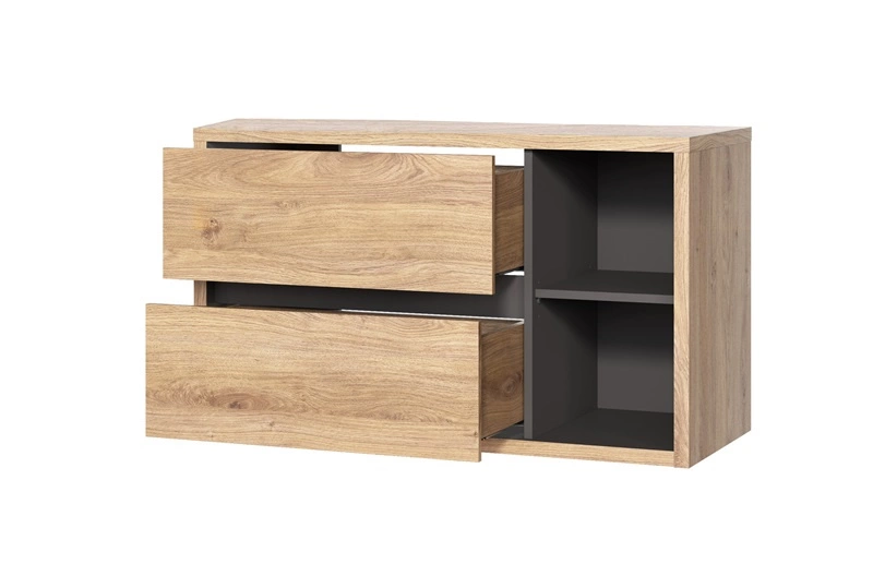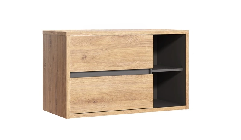 Szafka pod umywalkę Devon to połączenie prostej i stonowanej formy z imitującym drewno dekorem dąb shetland, pozwalające stworzyć harmonijne i wyjątkowe wnętrze. Całości dopełniają otwarte półki i wstawki w kontrastującym grafitowym kolorze. Prosta konstrukcja, a także unikatowe wzornictwo szafki do łazienki z kolekcji Devon nada każdej łazience szczególnego charakteru i estetycznego wyglądu.