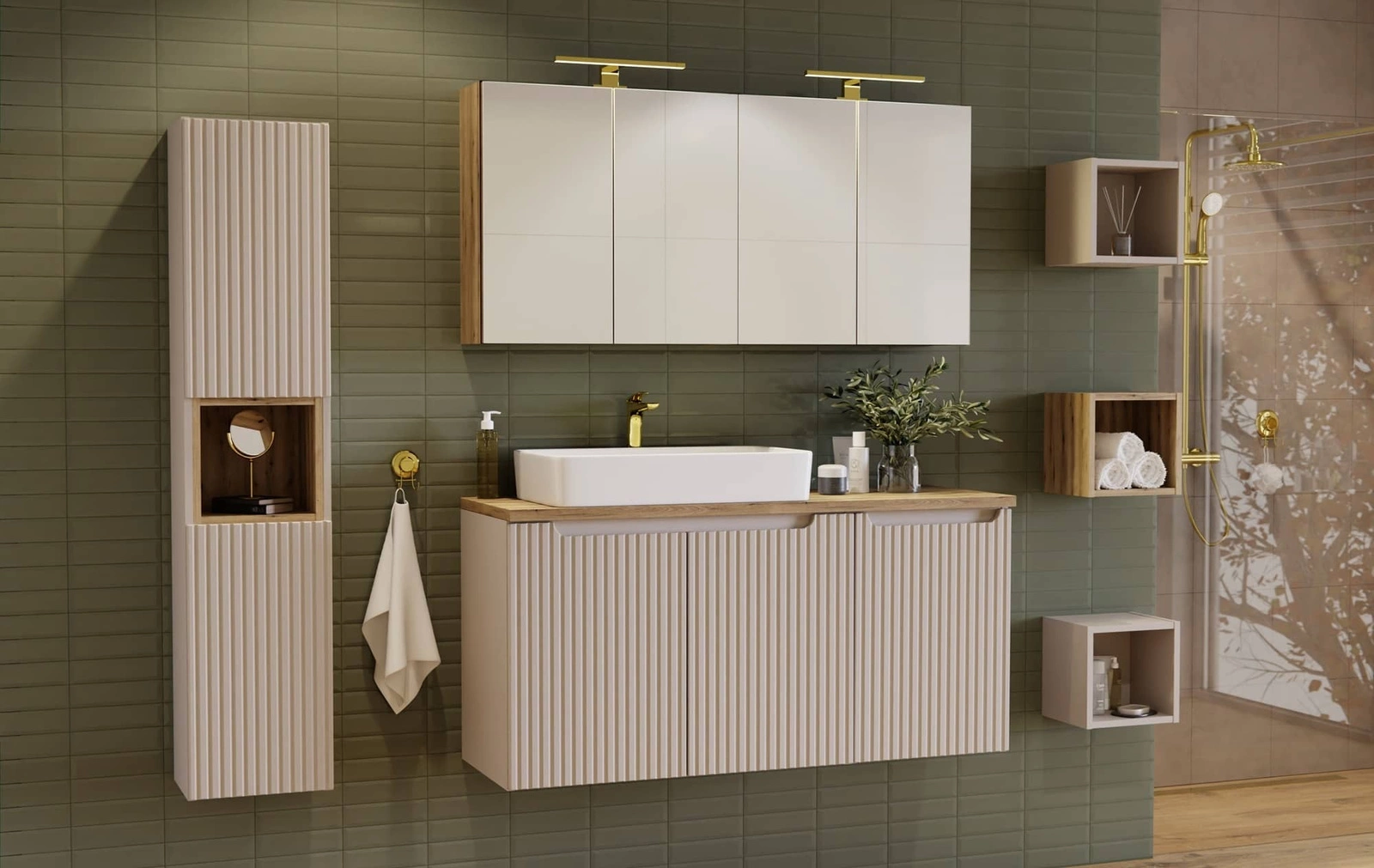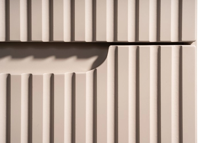 Szafka pod umywalkę z kolekcji Nova łączy w sobie klasę i harmonię, tworząc przy tym atmosferę spokoju i relaksu. Modny beżowy kolor w kaszmirowym odcieniu nie tylko przyciąga uwagę, ale także nadaje wnętrzu wyjątkowego, odważnego charakteru. Pionowe ryflowania na frontach mebli dodają subtelnej elegancji, podkreślając unikalność kolekcji mebli do łazienki Nova. Dodatkowym atutem szafki do łazienki są niezwykle oryginalne frezowane uchwyty, które poza swoją podstawową funkcją dodają meblom wyrafinowanego oraz efektownego wyglądu.
