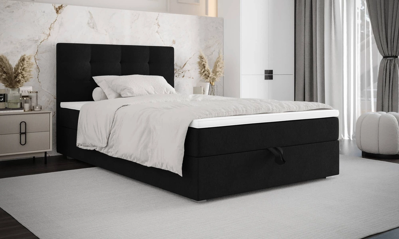 Łóżko kontynentalne Flint 90x200 w kolorze czarnym to idealny wybór do każdej sypialni lub pokoju młodzieżowego.