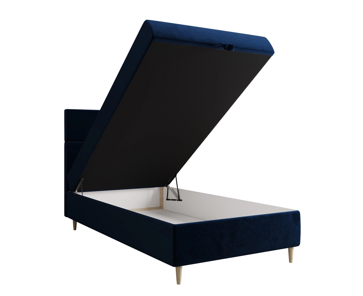 Łóżko kontynentalne Bing 90x200 granatowe w nowoczesnym skandynawskim stylu z tapicerowanym zagłówkiem łóżko z pojemnikiem