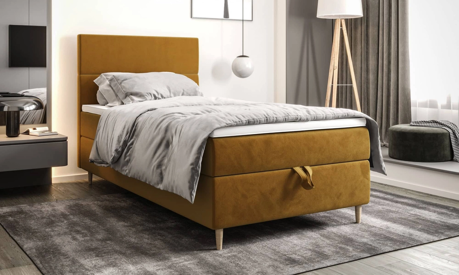 Łóżko kontynentalne Bing 100x200 w kolorze musztardowym to idealny wybór do każdej sypialni lub pokoju młodzieżowego.