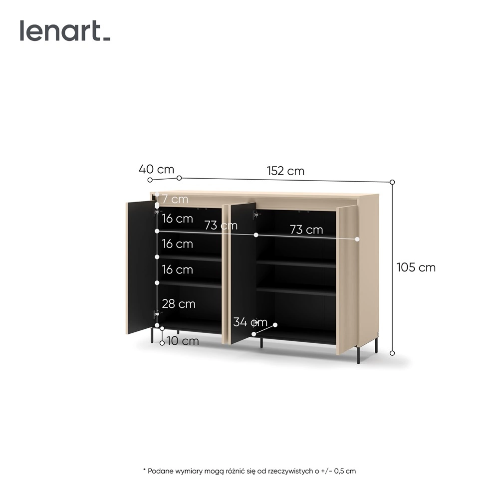 Ryflowane fronty zostały wykonane z płyty MDF o grubości 18mm. Korpus wykonany z wysokiej jakości płyty laminowanej, która charakteryzuje się odpornością na wpływ czynników zewnętrznych takich jak obicia, uderzenia i niefortunne zadrapania. Do otwierania drzwi komody zastosowano funkcjonalny, bezuchwytowy system push to open. Metalowe nogi w kontrastowym czarnym kolorze nadają wizualnej lekkości przy jednoczesnym utrzymaniu funkcjonalności.