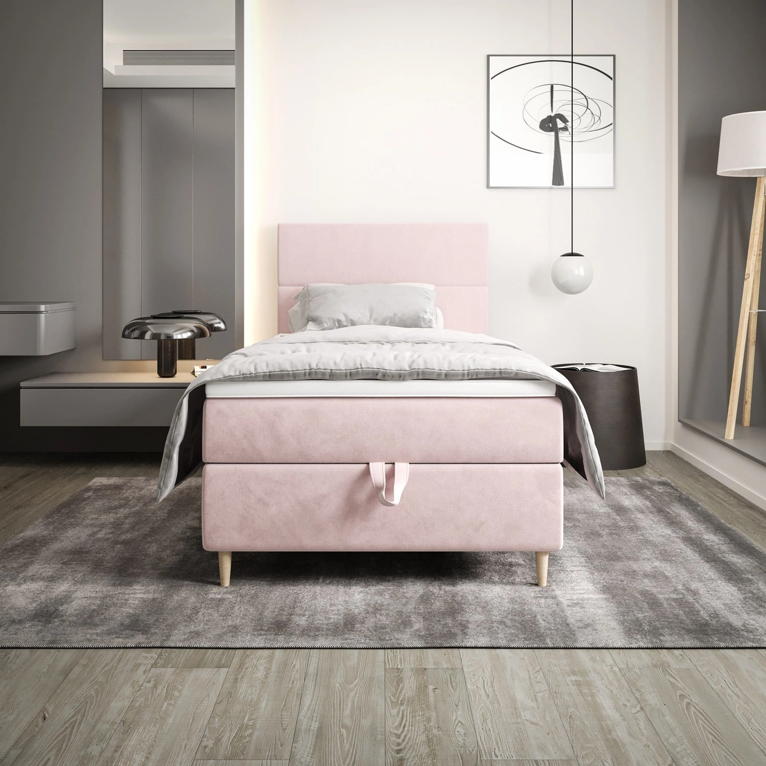Łóżko kontynentalne Bing 100x200 pudrowy róż w nowoczesnym skandynawskim stylu z tapicerowanym zagłówkiem łóżko z pojemnikiem
