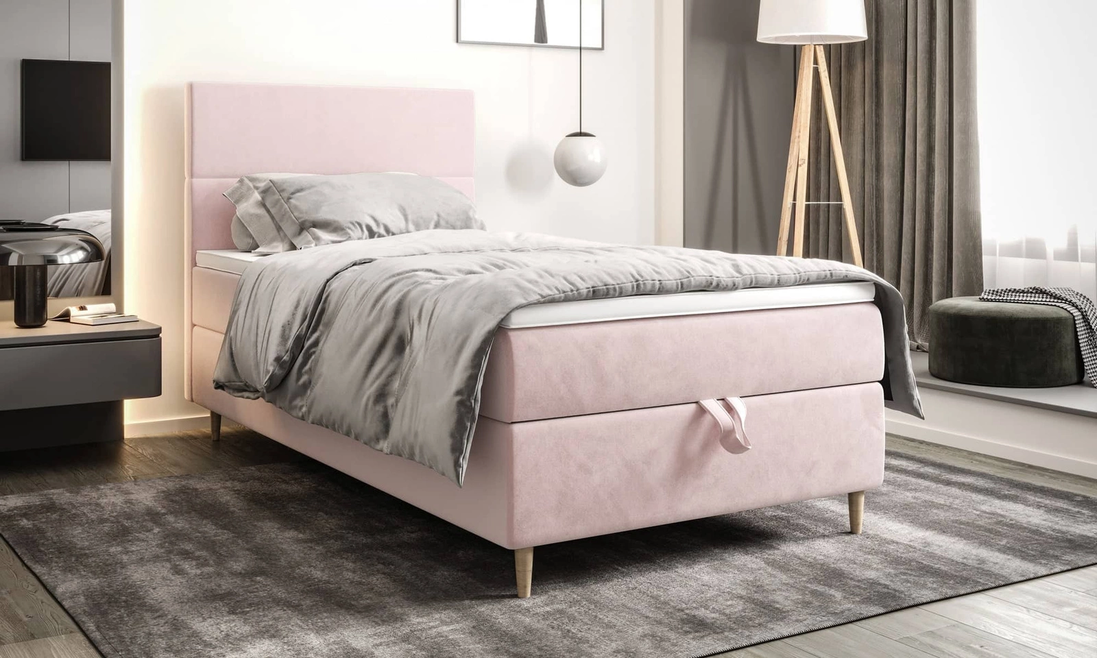 Łóżko kontynentalne Bing 100x200 w kolorze pudrowy róż to idealny wybór do każdej sypialni lub pokoju młodzieżowego.