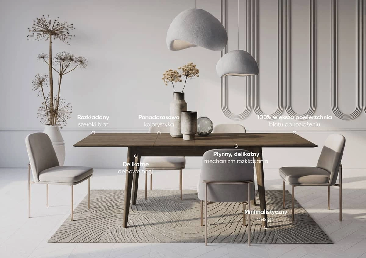 Stół rozkładany Plot to stylowy mebel, który łączy klasyczną elegancję z codziennym komfortem. Głęboki, bogaty kolor ciemnego dębu dodaje wnętrzu prestiżu, doskonale komponując się zarówno z nowoczesnym, jak i tradycyjnym stylem aranżacji. Możliwość łatwego rozłożenia zapewnia elastyczność oraz wszechstronność użytkowania. Prostokątny stół rozkładany to rozwiązanie, które pozwala zaoszczędzić miejsce i jednocześnie być zawsze gotowym na niespodziewanych gości. Stół z kolekcji Plot stanie się centralnym punktem Twojej jadalni, przyciągając wzrok, a także dodając wnętrzu wyjątkowego charakteru.