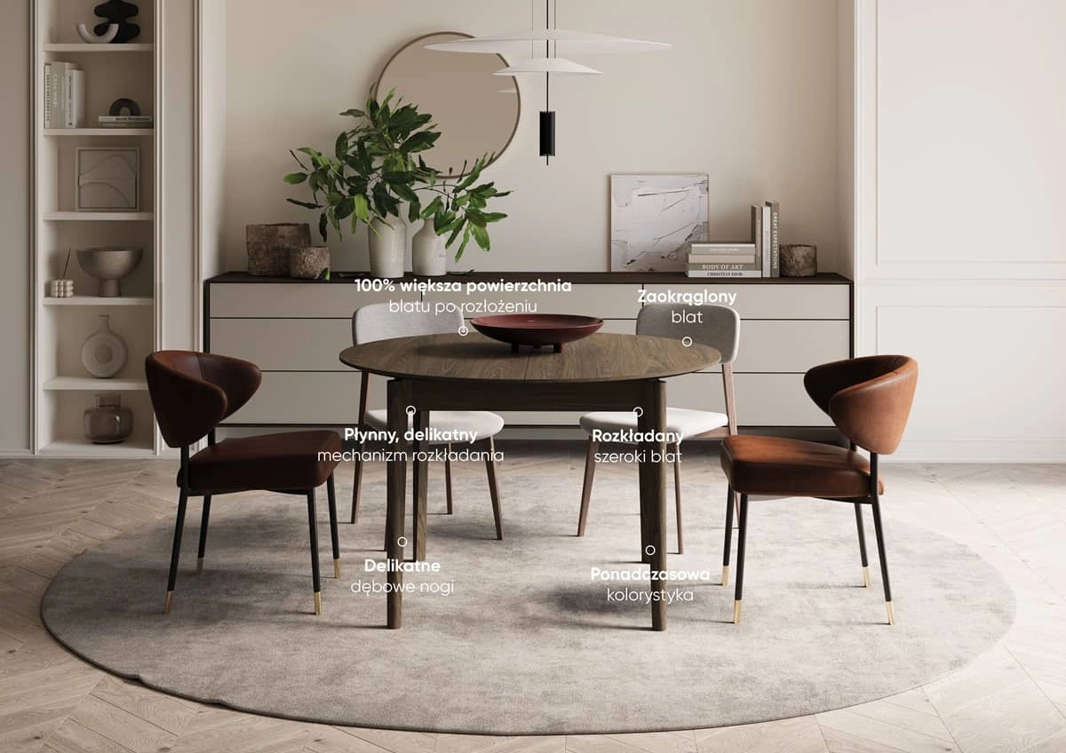 Stół rozkładany Plot to stylowy mebel, który łączy klasyczną elegancję z codziennym komfortem. Głęboki, bogaty kolor ciemnego dębu dodaje wnętrzu prestiżu, doskonale komponując się zarówno z nowoczesnym, jak i tradycyjnym stylem aranżacji. Możliwość łatwego rozłożenia zapewnia elastyczność oraz wszechstronność użytkowania. Stół okrągły rozkładany to rozwiązanie, które pozwala zaoszczędzić miejsce i jednocześnie być zawsze gotowym na niespodziewanych gości. Stół z kolekcji Plot stanie się centralnym punktem Twojej jadalni, przyciągając wzrok, a także dodając wnętrzu wyjątkowego charakteru.