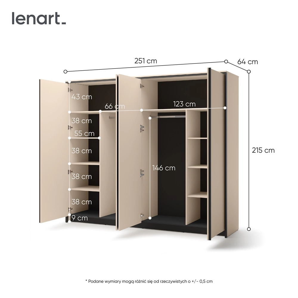Szafa jest skonstruowana z 4 drzwi. Szafa gwarantuje komfortowe i bezproblemowe korzystanie oraz trwałość całego mebla przez wiele lat użytkowania. Połączenie subtelnego beżu z czarnymi dodatkami sprawia, że szafa na ubrania z powodzeniem sprawdzi się jako szafa do sypialni, jako szafa do przedpokoju lub szafa do pokoju dziecięcego. Szafa Enna będzie również świetnym wyborem do pokoju niemowlęcego. Doskonale sprawdzi się także w roli garderoby do przedpokoju.