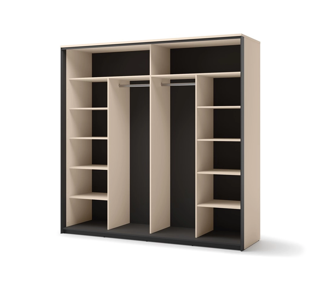 Szafa jest skonstruowana z 2 drzwi. Szafa gwarantuje komfortowe i bezproblemowe korzystanie oraz trwałość całego mebla przez wiele lat użytkowania. Połączenie subtelnego beżu z czarnymi dodatkami sprawia, że szafa na ubrania z powodzeniem sprawdzi się jako szafa z lustrem do sypialni, jako szafa do przedpokoju lub szafa do pokoju dziecięcego. Szafa przesuwna Enna będzie również świetnym wyborem do pokoju niemowlęcego. Doskonale sprawdzi się także w roli garderoby do przedpokoju.