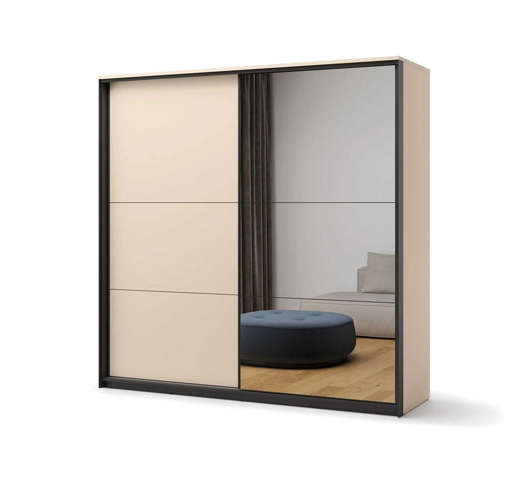 Szafa przesuwna z kolekcji Enna to mebel, który charakteryzuje się eleganckim designem połączonym z szeroką funkcjonalnością, dzięki czemu szafa z lustrem dopasuje się do sypialni jak również do przedpokoju. Modne połączenie beżu w piaskowym odcieniu z czarnymi dodatkami sprawia, że całość prezentuje się bardzo stylowo. Prosta konstrukcja oraz gładkie wykończenie frontów sprawia, że całość jest harmonijna, zamknięta w subtelnym tonie. Obecność szafy na ubrania umożliwi ciekawe zaaranżowanie każdej przestrzeni.