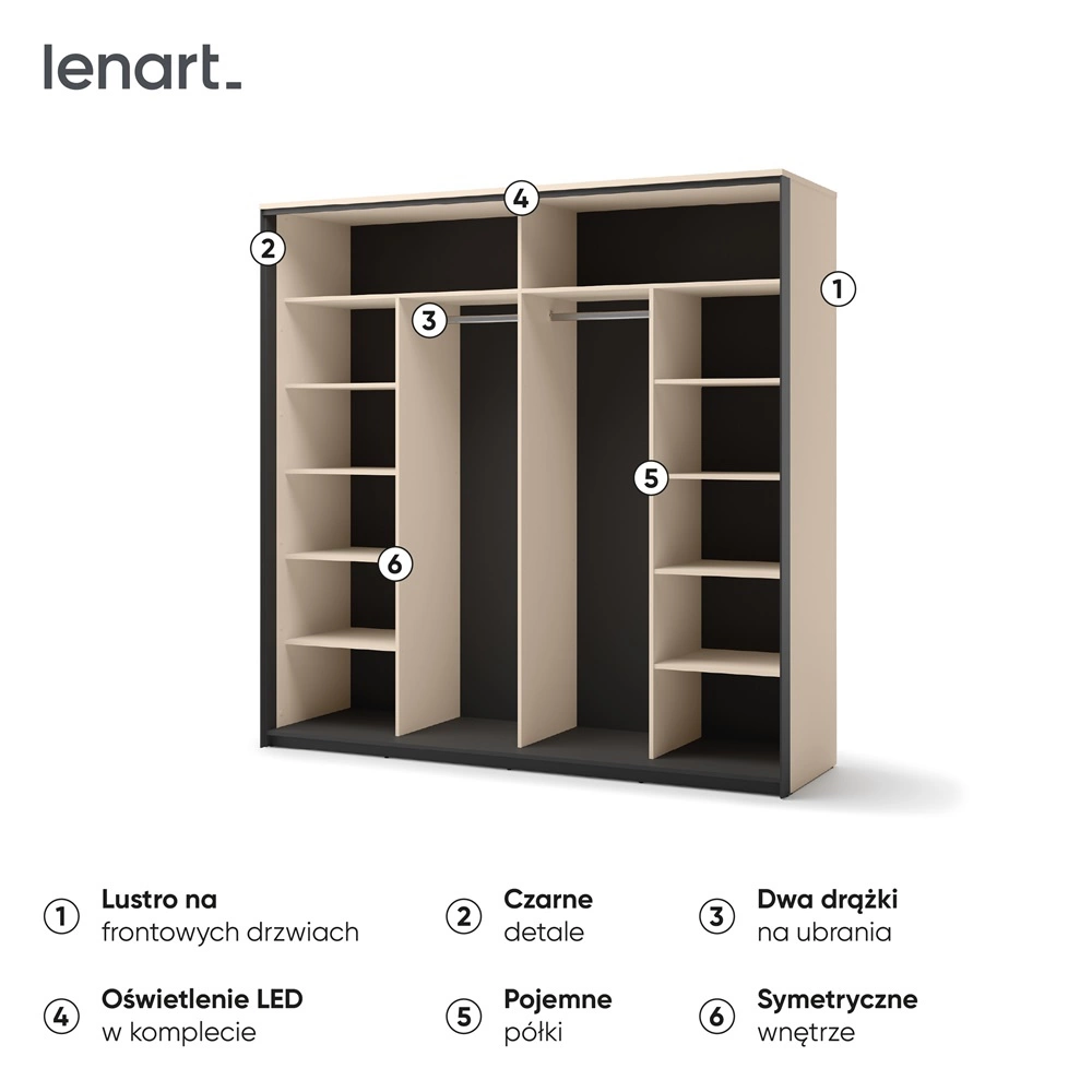 • Szafa przesuwna z lustrem Enna przyciąga uwagę swoim wyglądem i funkcjonalnością. Lekka stylistyka oraz nowoczesne wzornictwo znajdzie zastosowanie w każdym wnętrzu. Dyskretne oświetlenie LED i czarne dodatki podkreślą nietuzinkowy styl szafy.