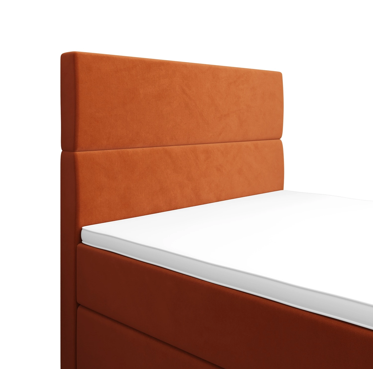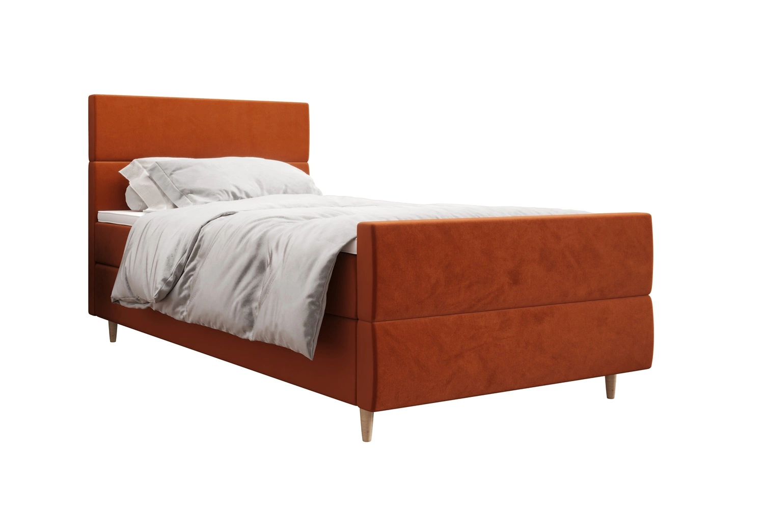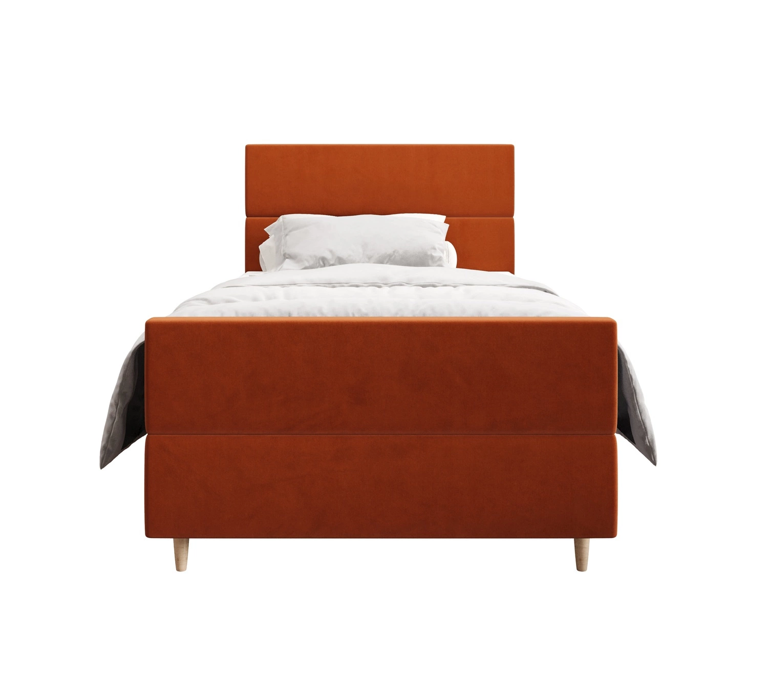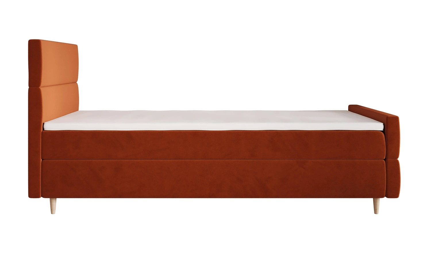 Łóżko kontynentalne Benet 120x200 ceglaste w nowoczesnym skandynawskim stylu z tapicerowanym zagłówkiem oraz zanóżkiem łóżko z pojemnikiem