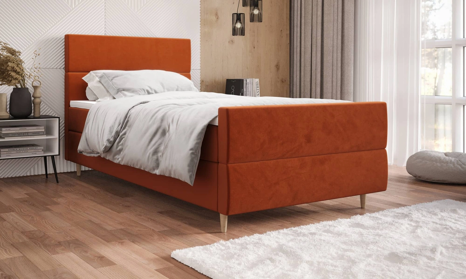 Łóżko kontynentalne Benet 120x200 w kolorze ceglastym to idealny wybór do każdej sypialni lub pokoju młodzieżowego.